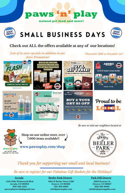 Paws 'n' Play is a unique store that has existed in Arvada for 22 years! We here at Paws 'n' Play are thankful for the continued support shown from the Arvada community these last 22 years and look forward to many more! We specialize in natural foods, treats, supplements, toys & much more. Our belief is that feeding good quality food makes for a healthy and happy pet, which in turn makes a much happier person! Since we are a small local shop, we focus on the individual needs of our customers, whether they have two legs or four.
