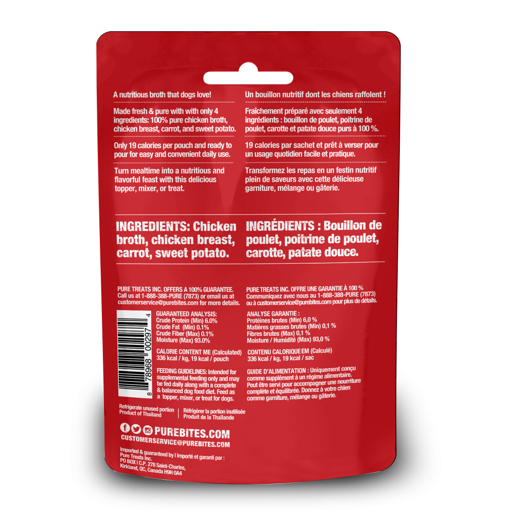 At PureBites, we?re always asking pet parents to ?Go Ahead, look at our ingredients?. Simplicity and the high-quality ingredients we choose to feed our family makes a difference. At PureBites, this means every member of our family. PureBites Chicken & Vegetables Broth is the ultimate limited ingredient treat, topper, or mixer. Made with only 4 simple human grade ingredients: chicken broth, chicken breast, carrot, and sweet potato. Nothing else. No artificial colors, fillers, sweeteners, or preservatives. PureBites Broths are a great way to make mealtime fun and exciting, with chicken and vegetables in a rich broth that dogs crave and the added nutrients that pet parents love.