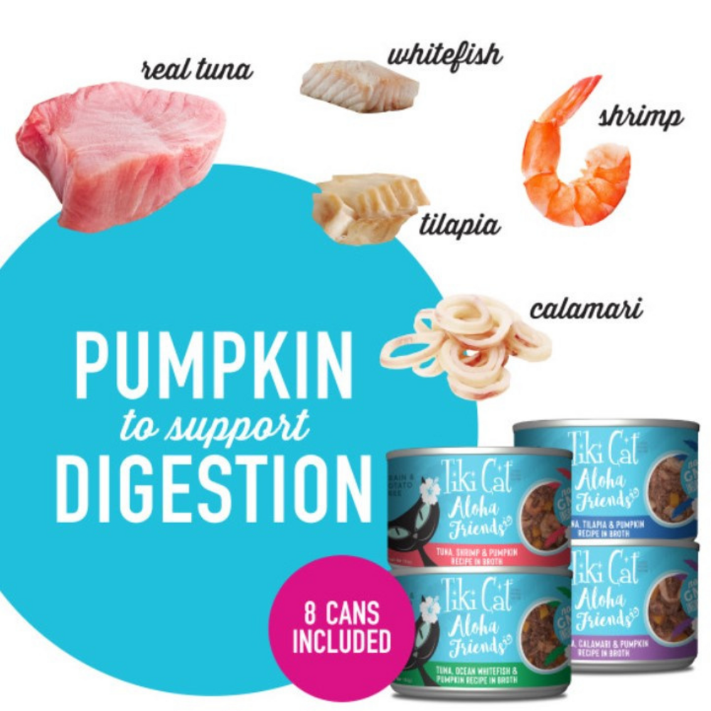 12-can Variety Pack featuring 4 Grain Free Flavors:3 cans of Tuna with Tilapia and Pumpkin3 cans of Tuna with Ocean Whitefish and Pumpkin3 cans of Tuna with Shrimp and Pumpkin3 cans of Tuna with Calamari and PumpkinMade with whole fish & pumpkin, Tiki Cat® Aloha Friends™brand cat food provides a complete and balanced, and highly digestible diet for cats.-Fresh, Sustainably Sourced Ingredients that are GMO and Gluten Free-Wild Caught, Dolphin Safe Tuna, Mercury Tested for Safety-With Pumpkin, a High Moisture, Gentle Fiber, Rich in Antioxidants-Hand-Packed in Human-Grade Facilities-Complete & Balanced for All Life Stages-Grain Free