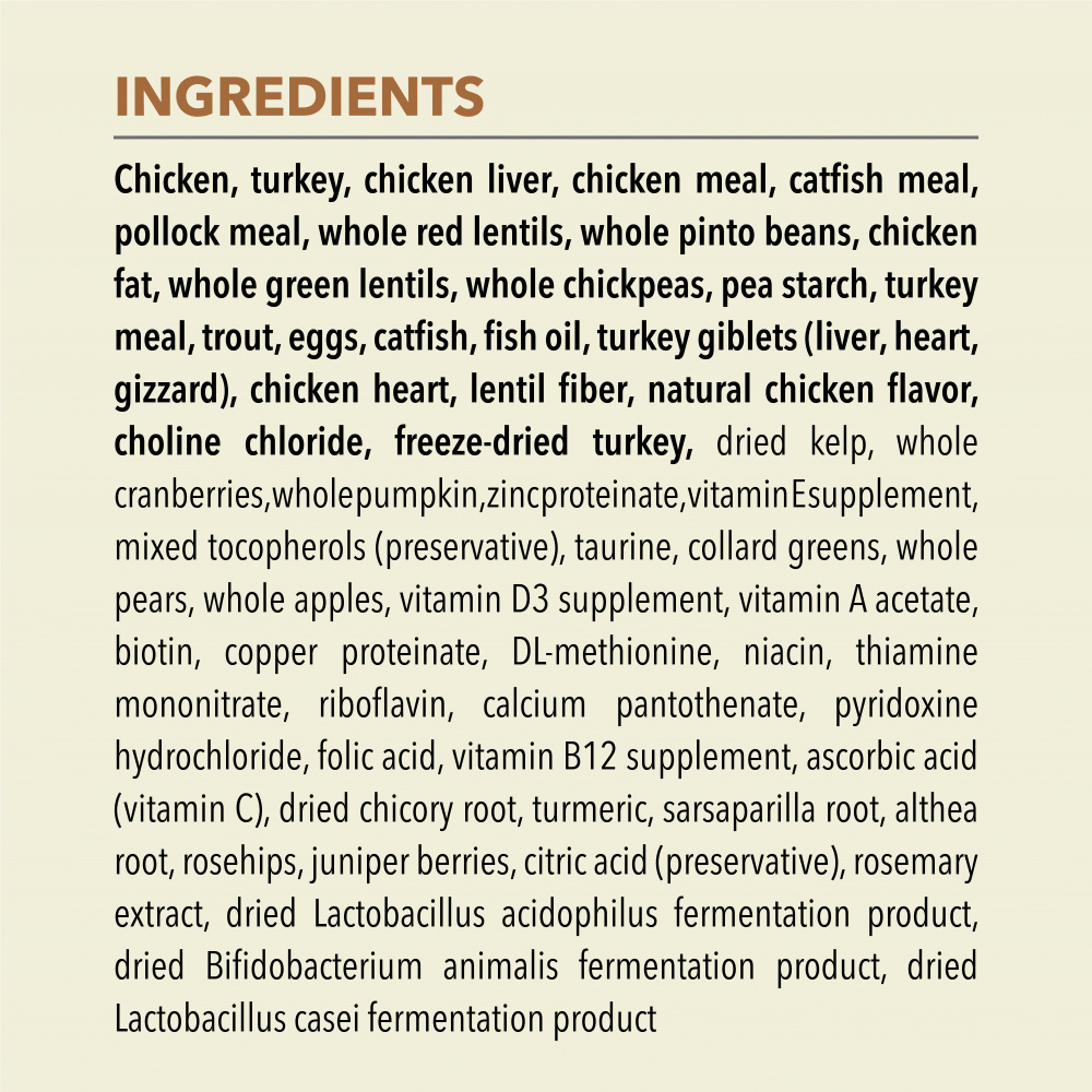 Chicken, turkey, chicken liver, chicken meal, catfish meal, pollock meal, whole red lentils, whole pinto beans, chicken fat, whole green lentils, whole chickpeas, pea starch, turkey meal, trout, eggs, catfish, fish oil, turkey giblets (liver, heart, gizzard), chicken heart, lentil fiber, natural chicken flavor, choline chloride, freeze-dried turkey, dried kelp, whole cranberries, whole pumpkin, zinc proteinate, vitamin E supplement, mixed tocopherols (preservative), taurine, collard greens, whole pears, whole apples, vitamin D3 supplement, vitamin A acetate, biotin, copper proteinate, DL-methionine, niacin, thiamine mononitrate, riboflavin, calcium pantothenate, pyridoxine hydrochloride, folic acid, vitamin B12 supplement, ascorbic acid (vitamin C), dried chicory root, turmeric, sarsaparilla root, althea root, rosehips, juniper berries, citric acid (preservative), rosemary extract, dried Lactobacillus acidophilus fermentation product, dried Bifidobacterium animalis fermentation product, dried Lactobacillus casei fermentation productGuaranteed Analysis