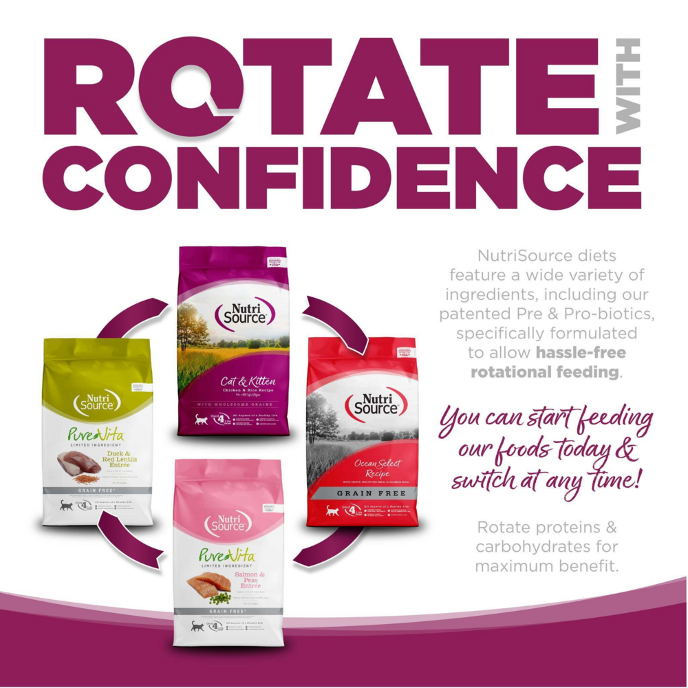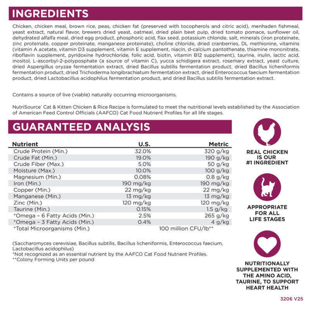 Health & happiness start in the gut – our specialty. At family-owned NutriSource, we believe the secret to health is successful digestion and absorption of balanced nutrition. That’s why we focus on supporting the gut microbiome with our proprietary blend of prebiotics, probiotics, trace minerals and selenium yeast. We call our gut-focused proprietary blend Good4Life because these ingredients nourish the gut microbiome, building the ultimate foundation for a long and happy life. Scientifically formulated, NutriSource Cat & Kitten Chicken & Rice includes a blend of chicken, rice, carefully selected ingredients, and Good4Life to provide essential nutrients for optimum health and long life. Feed with confidence knowing that you’re part of a family that loves your pets just as much as you do. Health begins here.