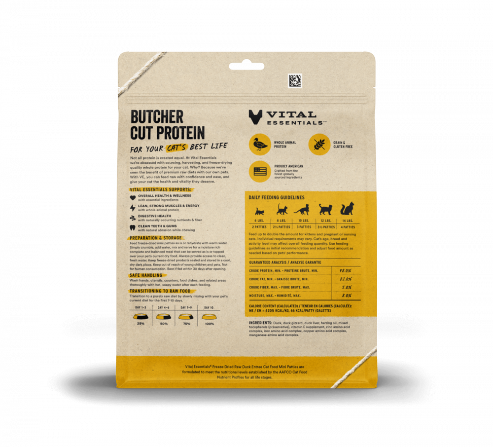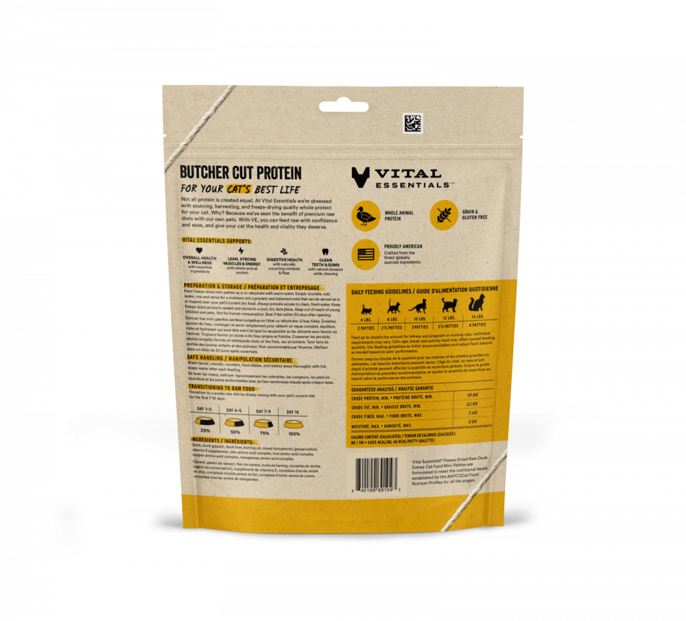 Vital Essentials Vital Cat Duck Dinner Patties Freeze-Dried Cat Food is made from pure, raw Duck. We never use added hormones or antibiotics, no added fillers, flavoring or rendered by-products. Single ingredient, high protein cat treats support your cat?s health, naturally. Cats love the taste because we use a 48-hour slow freeze-drying process that locks in the natural flavor, texture and freshness of the meat without compromising the nutritional value. A healthy, nutritious and delicious way to feed your cat between meals. Food with real meat your cat instinctively craves.
