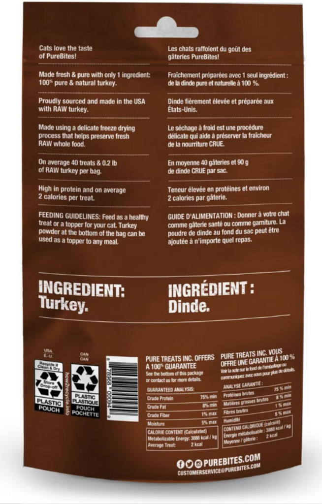 '100% NaturalCats Love the taste of PureBites!Spoil your cat with 100% natural treatsCats crave the delicious taste of turkeyFreeze-dried to preserve the natural nutrition and freshnessHigh in protein and less than 2 calories per treat'