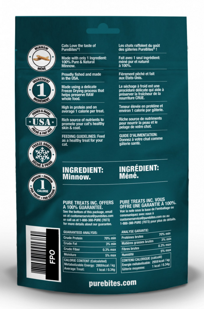 Go ahead, turn the bag around and look at our ingredients. PureBites® are made with only 1 ingredient; 100% Pure & Natural Ocean-Caught Human Grade Minnow. Cats love the taste of PureBites® because our treats are freeze dried RAW to lock in the aroma, texture and freshness they crave. Cat parents love PureBites® because our treats are 100% pure and rich in nutrients for a happy and healthy life. PureBites® Minnow is proudly Wild-Caught from the Ocean and Made in the USA with human Grade Minnow. High in protein and in Omega 3 & 6 Fatty Acids with on average 1 calorie per treat. PureBites® are made using a delicate freeze drying process that preserves the nutritional integrity of RAW fresh whole food. Only water is removed, preserving all the characteristics and natural nutrition of fresh Ocean-Caught Human Grade Minnow. Our products are ideal for cats with health issues or pets that are overweight, diabetic, have allergies, gastrointestinal disorders, or are on a restricted diet. PureBites® Minnow 1.09oz | 31g has 6.4oz of RAW Minnow per bag and on average 308 treats per bag.