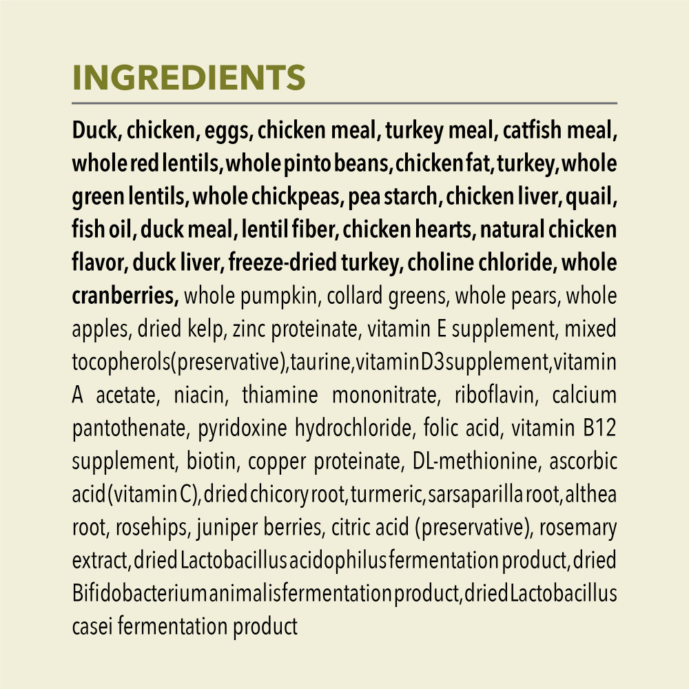 Duck, chicken, eggs, chicken meal, turkey meal, catfish meal, whole red lentils, whole pinto beans, chicken fat, turkey, whole green lentils, whole chickpeas, pea starch, chicken liver, quail, fish oil, duck meal, lentil fiber, chicken hearts, natural chicken flavor, duck liver, freeze-dried turkey, choline chloride,whole cranberries,whole pumpkin, collard greens, whole pears, whole apples, dried kelp, zinc proteinate, vitamin E supplement, mixed tocopherols (preservative), taurine, vitamin D3 supplement, vitamin A acetate, niacin, thiamine mononitrate, riboflavin, calcium pantothenate, pyridoxine hydrochloride, folic acid, vitamin B12 supplement, biotin, copper proteinate, DL-methionine, ascorbic acid (vitamin C), dried chicory root, turmeric, sarsaparilla root, althea root, rosehips, juniper berries, citric acid (preservative), rosemary extract, dried Lactobacillus acidophilus fermentation product, dried Bifidobacterium animalis fermentation product, dried Lactobacillus casei fermentation productGuaranteed Analysis