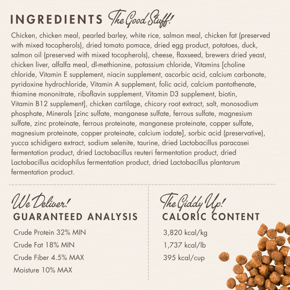 Chicken, chicken broth, chicken liver, duck, salmon, pearled barley, white rice, potatoes, tomato paste, ground miscanthus grass, Minerals [dicalcium phosphate, zinc sulfate, magnesium sulfate, ferrous sulfate, zinc proteinate, calcium carbonate, copper sulfate, iron proteinate, sodium selenite, calcium iodate, manganese sulfate, copper proteinate, manganese proteinate], salmon oil (preserved with mixed tocopherols), xanthan gum, agaragar, potassium chloride, salt, chicory root extract, chicken cartilage, taurine, yucca schidigera extract, choline chloride, Vitamins [Vitamin E supplement, niacin supplement, thiamine mononitrate, Vitamin A supplement, calcium pantothenate, riboflavin supplement, pyridoxine hydrochloride, Vitamin B12 supplement, Vitamin D3 supplement, folic acid].Guaranteed Analysis