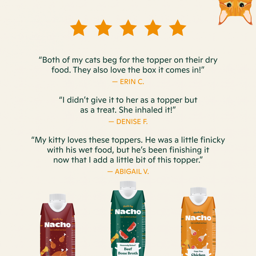 The easiest way to keep your cat hydrated. With prebiotics to support healthy digestion. Grain-free recipe. No corn, wheat or soy.Lifelong cat dad, Chef Bobby Flay, was inspired by his cats Nacho and Stella, to create Made by Nacho, premium cat food that meets a chef's exciting standards. Premium Protein, Irresistible Bone broth, Super fruits & veggies, and only the good stuff no fillers!