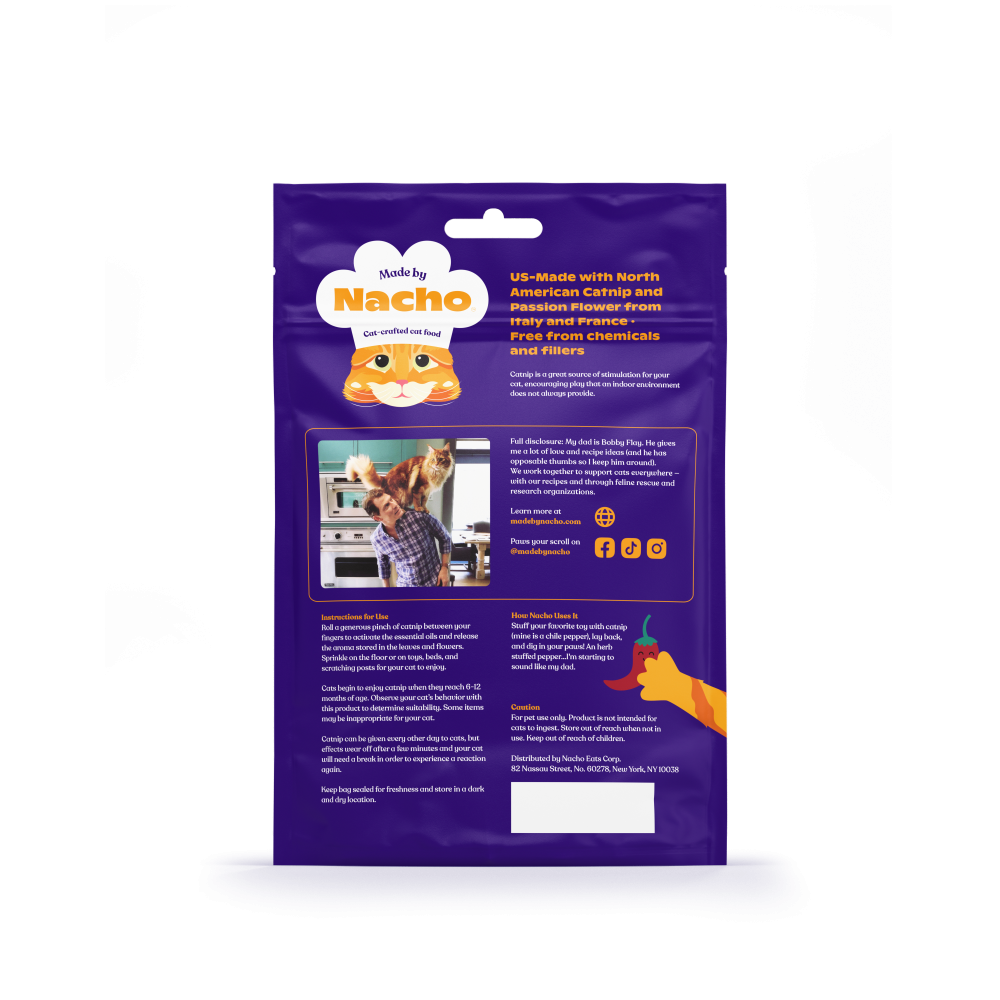 Made with North American Catnip harvested at peak on a small family farm in Alberta, Canada. Hand-sifted Passion Flower sourced from France and Italy. Free from chemicals and fillers. Naturally stimulating catnip fuels play, while passion flower encourages a sense of relaxation - making this blend the best of both worlds. Crafted to help cats everywhere let loose, have fun and get their chill on.