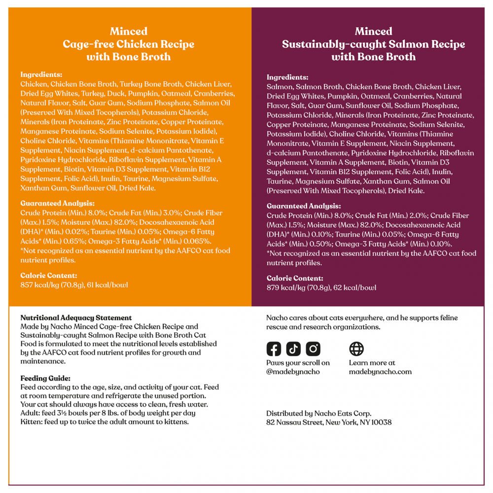 Made in USA with the finest globally sourced ingredients; Complete and Balanced natural wet cat food with added vitamins, minerals and taurine; Real animal protein is #1 ingredient; With bone broth for hydration, an irresistibly flavorful concentrated source of protein and collagen for healthy skin; With prebiotics for healthy digestion; Fruits and vegetables like cranberries and pumpkin - a blend that provides fiber and powerful antioxidants to support immune system; With oatmeal - provide fiber to support a healthy digestive tract and complex carbohydrates for sustained energy throughout the day; No corn, no wheat, no soy; No artificial colors, flavors of preservatives; With DHA for healthy cognition and Omega Fatty Acids for healty skin and coat