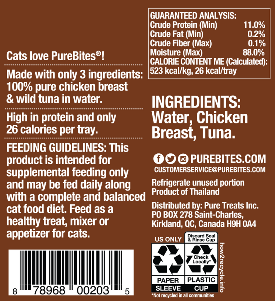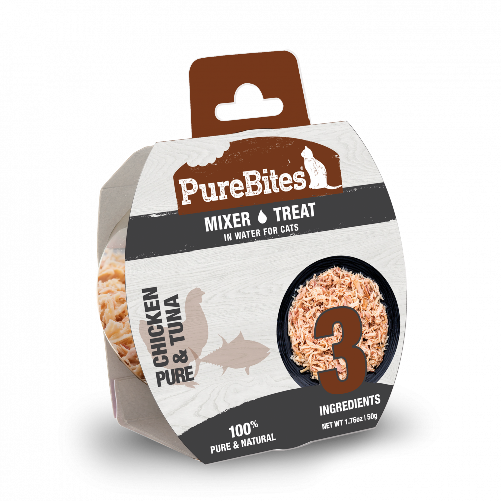 At PureBites, we?re always asking pet parents to ?Go ahead, look at our ingredients?. Simplicity and the high-quality ingredients we choose to feed our family makes a difference. At PureBites this means every member of our family. PureBites Chicken & Tuna Mixers are the ultimate limited ingredient cat treat, topper, appetizer, or mixer. Made with only 3 simple human grade ingredients: chicken breast, wild-caught skipjack tuna, and water. Nothing else. No artificial colors, fillers, sweeteners, or preservatives. PureBites Mixers are a great way to make snack time or mealtime fun and exciting, with a taste cats crave and the nutrients and hydration that pet parents love.