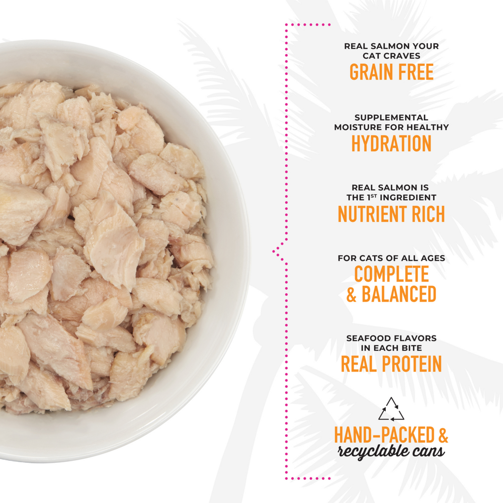 Wild Salmon In Salmon Consomme Tiki Cat Gourmet Whole Food Brand Cat Food Hanalei Luau is shredded wild caught Vancouver Salmon prepared in Salmon consommé for a grain free, gravy free, zero carb meal. Complete and balanced diet for all life stages