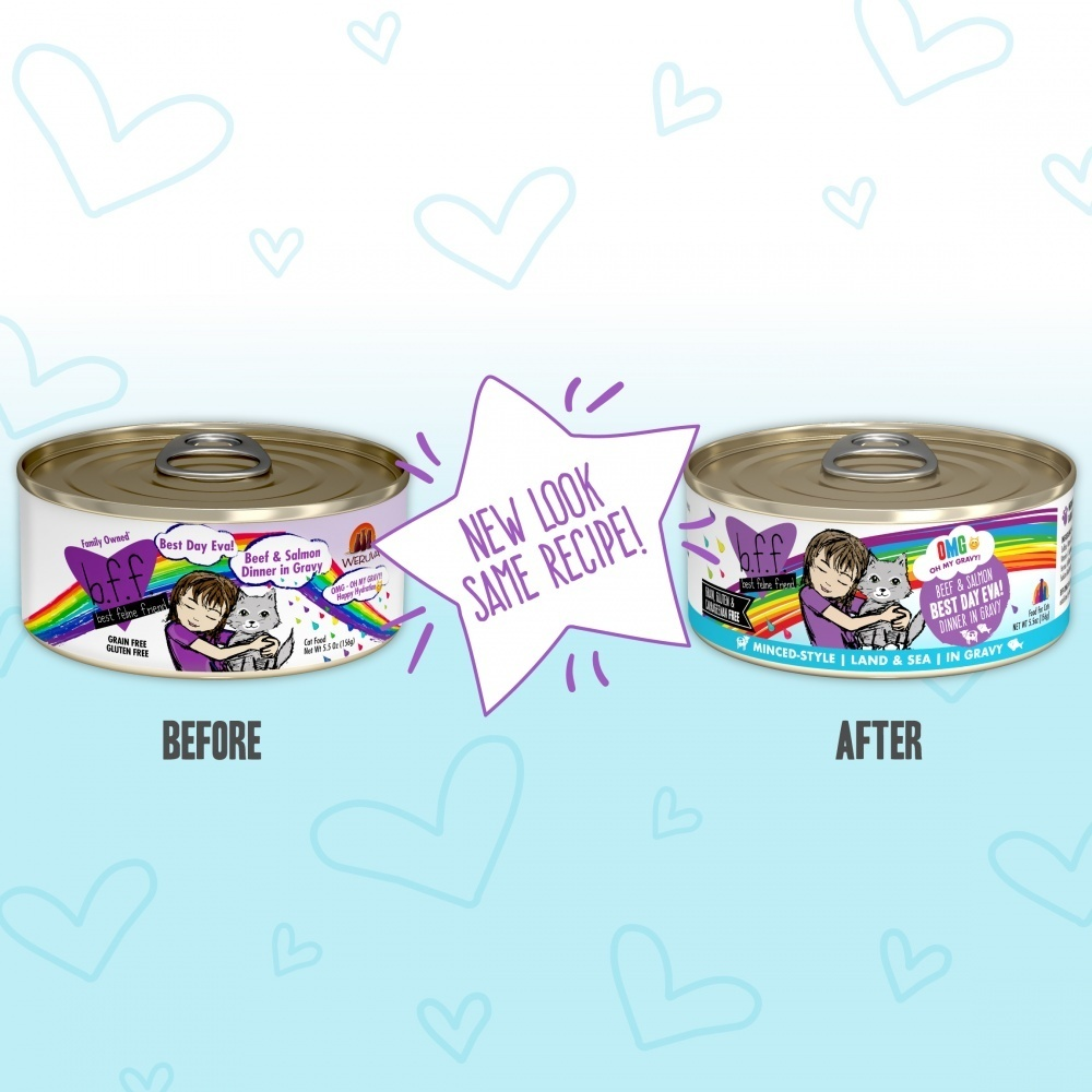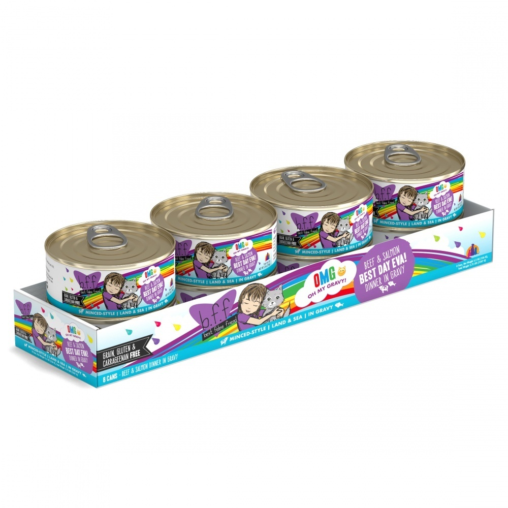 B.F.F. Oh My Gravy! - OMG!, from Best Feline Friends, is packed with hydration thanks to our unique recipes featuring an irresistible gravy base made from beef broth.-Best Day Eva! - 24 pack of 2.8oz cans with easy open lid featuring grass fed beef and salmon in gravy. -Hydration is our focus. OMG! Is a complete and balanced diet for adult maintenance with added vitamins, minerals, and antioxidants designed to support the health of your cat with optimal hydration. -Minimally processed and FREE OF Grain, Gluten, GMOs, MSGs, Carrageenan and any other bad stuff. That means NO corn, soy, wheat, or artificial colors or preservatives! -Sustainably sourced ingredients and produced in human food facilities under the strictest B.R.C. Global standards for foods - OMG! Is the real deal for your BFF!