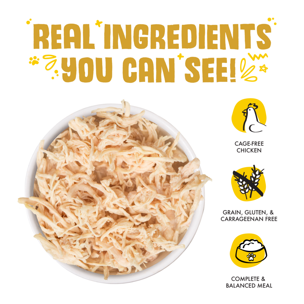 Chicken (Boneless, Skinless Breast), Chicken Broth, Potato Starch, Sunflower Seed Oil, Calcium Lactate, Xanthan Gum, Tricalcium Phosphate, Choline Chloride, Taurine, Zinc Sulfate, Vitamin E Supplement, Ferrous Sulfate, Nicotinic Acid (Vitamin B3), Thiamine Mononitrate (Vitamin B1), Calcium Pantothenate, Copper Sulfate, Riboflavin Supplement (Vitamin B2), Pyridoxine Hydrochloride (Vitamin B6), Vitamin A Supplement, Manganese Sulfate, Vitamin D3 Supplement, Folic Acid, Potassium Iodide, Sodium Selenite, Biotin, Vitamin B12 SupplementGuaranteed Analysis