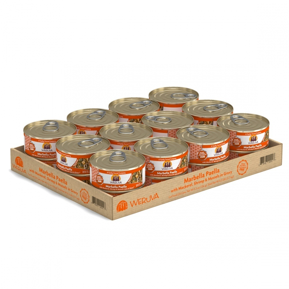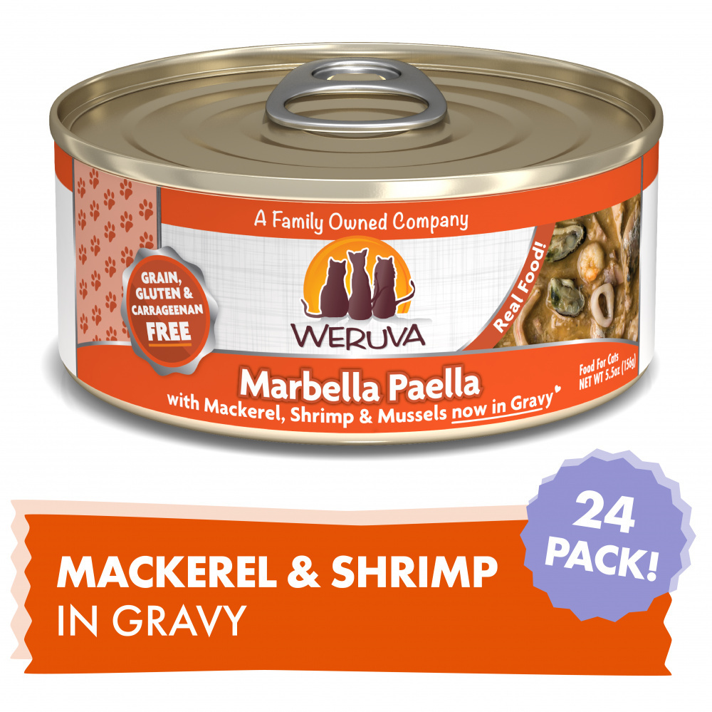 Hola! Spoil your cat with Weruva's Marbella Paella With Calamari Shrimp and Mussels Canned Cat Food. With plenty of the ocean's freshest delights including, mackerel, shrimp, and mussels your little carnivore is going to love this seafood medley. This food contains omega-3s for a healthy coat, keeping your cat ready for their trip to Spain looking muy bueno. Weruva Marbella Paella With Calamari Shrimp and Mussels Canned Cat Food is free of carrageenan for a healthy, growing cat.