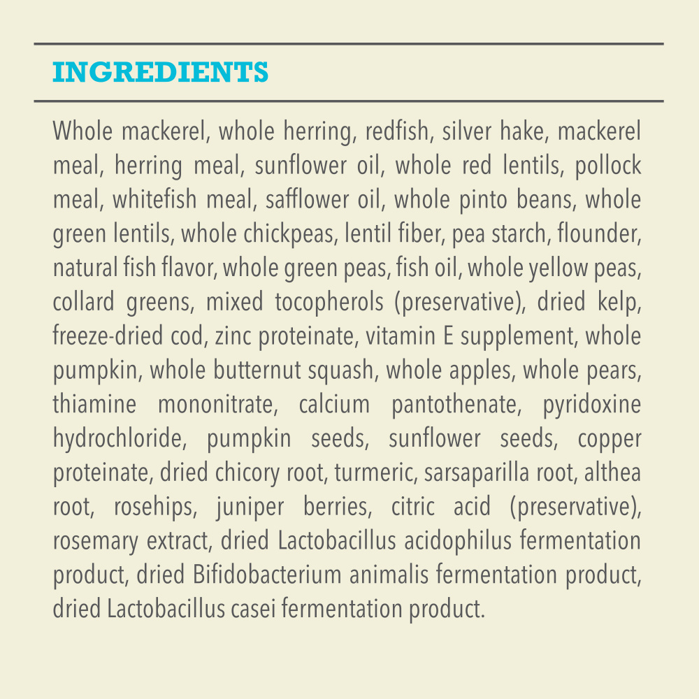 'Whole mackerel, whole herring, whole redfish, silver hake, mackerel meal, herring meal, sunflower oil, whole red lentils, pollock meal, whitefish meal, safflower oil, whole pinto beans, whole green lentils, whole chickpeas, lentil fiber, pea starch, flounder, Natural fish flavor, whole green peas, fish oil, whole yellow peas, collard greens, mixed tocopherols (preservative), dried kelp, freeze-dried cod liver, zinc proteinate, vitamin E supplement, whole pumpkin, whole butternut squash, whole carrots, whole apples, whole pears, thiamine mononitrate, calcium pantothenate, pyridoxine hydrochloride, pumpkin seeds, sunflower seeds, copper proteinate, chicory, turmeric, sarsaparilla, althea root, rosehips, juniper berries, citric acid (preservative), rosemary extract, dried Lactobacillus acidophilus fermentation product, dried Bifidobacterium animalis fermentation product, dried Lactobacillus casei fermentation product.'Guaranteed Analysis
