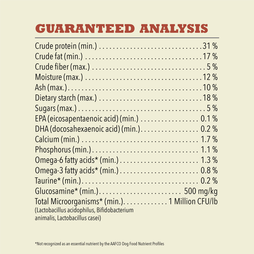 Beef, beef meal, beef liver, sweet potato, whole chickpeas, beef fat, whole lentils, whole pumpkin, fish oil, lentil fiber, natural flavor, beef tripe, whole cranberries, salt, choline chloride, taurine, dried kelp, vitamin E supplement, zinc proteinate, mixed tocopherols (preservative), vitamin D3 supplement, niacin, thiamine mononitrate, calcium pantothenate, pyridoxine hydrochloride, riboflavin, folic acid, vitamin B12 supplement, copper proteinate, freeze-dried beef, dried chicory root, turmeric, citric acid (preservative), rosemary extract, dried Lactobacillus acidophilus fermentation product, dried Bifidobacterium animalis fermentation product, dried Lactobacillus casei fermentation product.Guaranteed Analysis