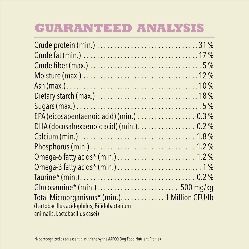 'Lamb, lamb meal, lamb liver, sweet potato, whole chickpeas, fish oil, whole lentils, lentil fiber, whole apples, sunflower oil, natural lamb flavor, lamb tripe, whole pumpkin, whole cranberries, salt, choline chloride, taurine, dried kelp, zinc proteinate, vitamin E supplement, mixed tocopherols (preservative), selenium yeast, niacin, thiamine mononitrate, calcium pantothenate, pyridoxine hydrochloride, riboflavin, folic acid, vitamin B12 supplement, copper proteinate, freeze-dried lamb, dried chicory root, turmeric, citric acid (preservative), rosemary extract, dried Lactobacillus acidophilus fermentation product, dried Bifidobacterium animalis fermentation product, dried Lactobacillus casei fermentation product.'