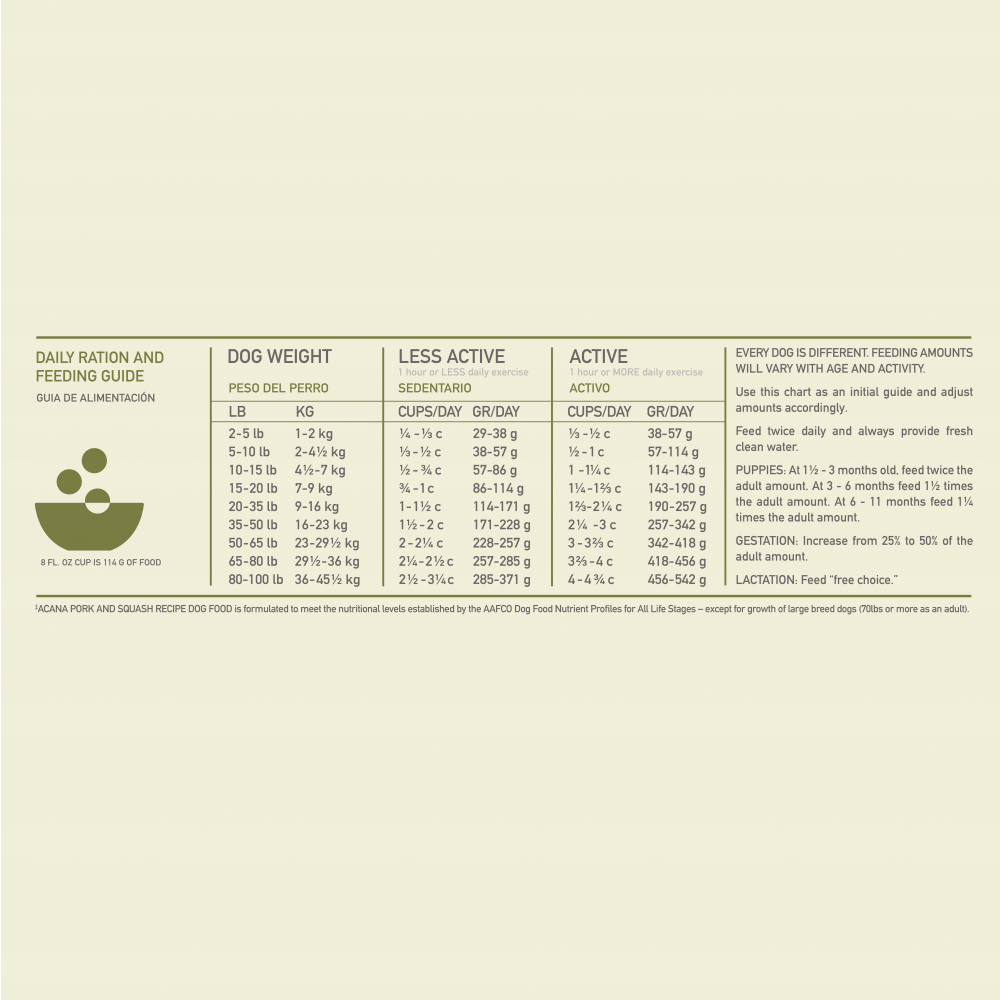 'Help your best friend be at their best with the protein-rich and nutrient-dense ACANA Singles Limited Ingredient Dry Dog Food, Grain Free*, High Protein, Pork and Squash recipe. This grain free* dry dog food delivers complete nutrition for choosy dogs, made with 65 percent*** animal ingredients from a single animal source** 35 percent**** whole fruit, veggies and nutrients. This ACANA dog food contains pork and pork liver, plus yummy butternut squash, pumpkin and sweet potato for a balanced diet to help your pooch maintain a healthy weight. ACANA doesn't add low-cost ingredients like soy, corn or wheat to ensure your furry family member gets only the best. Choose ACANA dry dog food to give your companion the nutritional foundation they need to live a happy, healthy life.*Produced in a facility that also processes grains **Recipes also include fish oil ***Approximate and derived from the unprocessed state of the ingredients ****We also add vitamins, minerals, natural preservatives, flavors and probiotics'