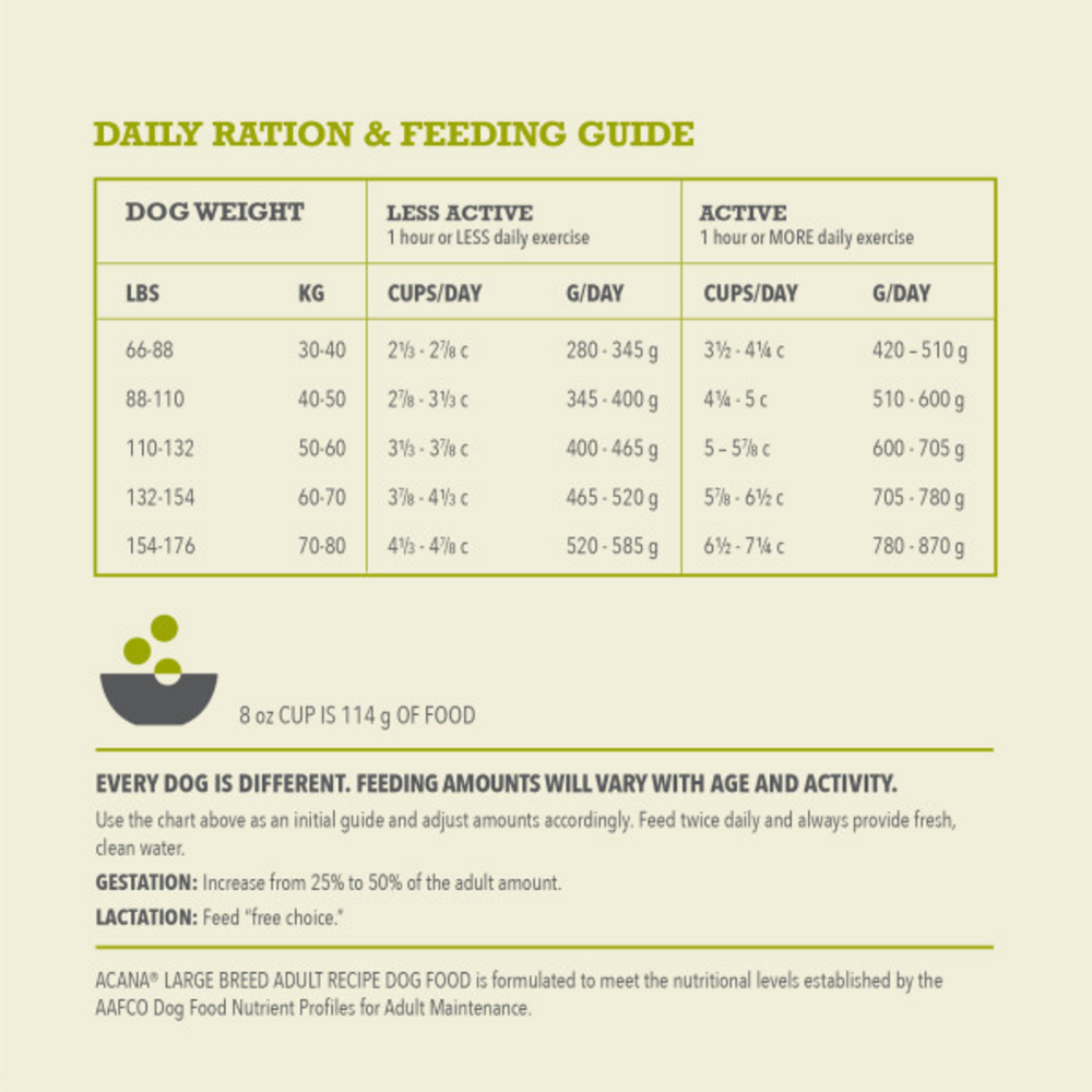 Bring home the quality nutrition your dog needs to thrive with ACANA Wholesome Grains Large Breed Adult Recipe Dry Dog Food. This high protein dog food is formulated for adult, large breed dogs (70 lbs or more as an adult) and includes probiotics for dogs to offer dog digestive support. Protein-rich free run* chicken and free run* turkey are balanced with wholesome, fiber-rich grains to help support your large breed dog's digestive health. The dry dog food is 65 percent** animal ingredients and 35 percent*** wholesome grains, fruit and vegetables. Even better, the nutritious ingredients in this ACANA dog food support the unique needs of your large breed adult dog, helping support joint health, immune support, digestive health and weight. Choose ACANA Wholesome Grains Dry Dog Food today to give your companion the nutritional foundation they need to live a happy, healthy life. *Our free-run chickens and turkeys are not housed in cages and are able to move in a barn without outdoor access **Approximate and derived from the unprocessed state of the ingredients ***We also add vitamins, minerals, natural preservatives, flavors and probiotics