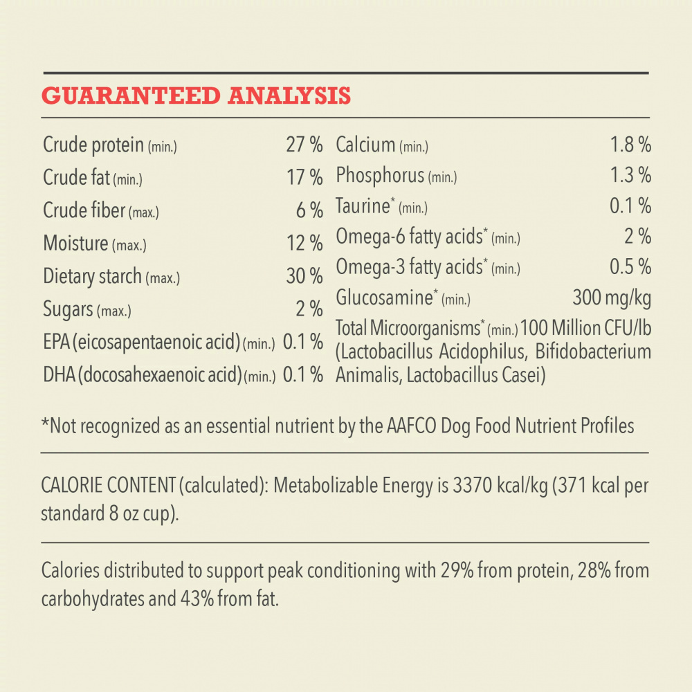 - High protein dog food kibble recipe features farm-raised beef, Yorkshire pork and raw lamb and is balanced to include 60 percent* high-quality animal ingredients and 40 percent** wholesome grains, fruit, vegetables and nutrients
