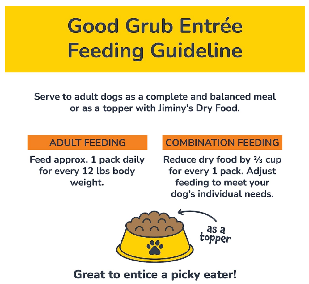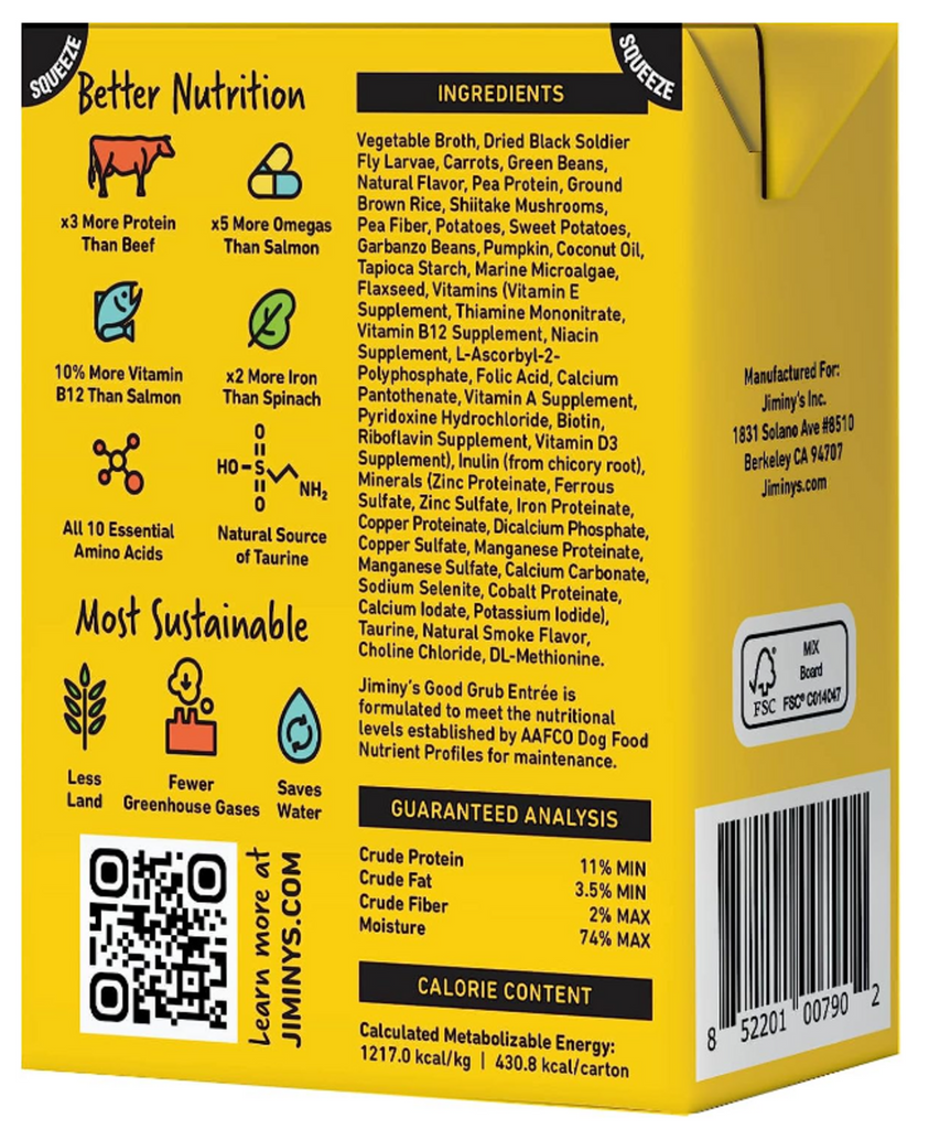 Jiminy's Good Grub Entree is a complete and balanced meal for your dog but it can also be used as a topper to entice a picky eater. Made with an alternative protein insect protein (BSFL) - it's great for dogs with allergies or food sensitivities. Best of all, it's an eco-friendly choice for your dog. Our grubs use less land and water to produce than traditional protein - it even comes in a recyclable tetra pack!