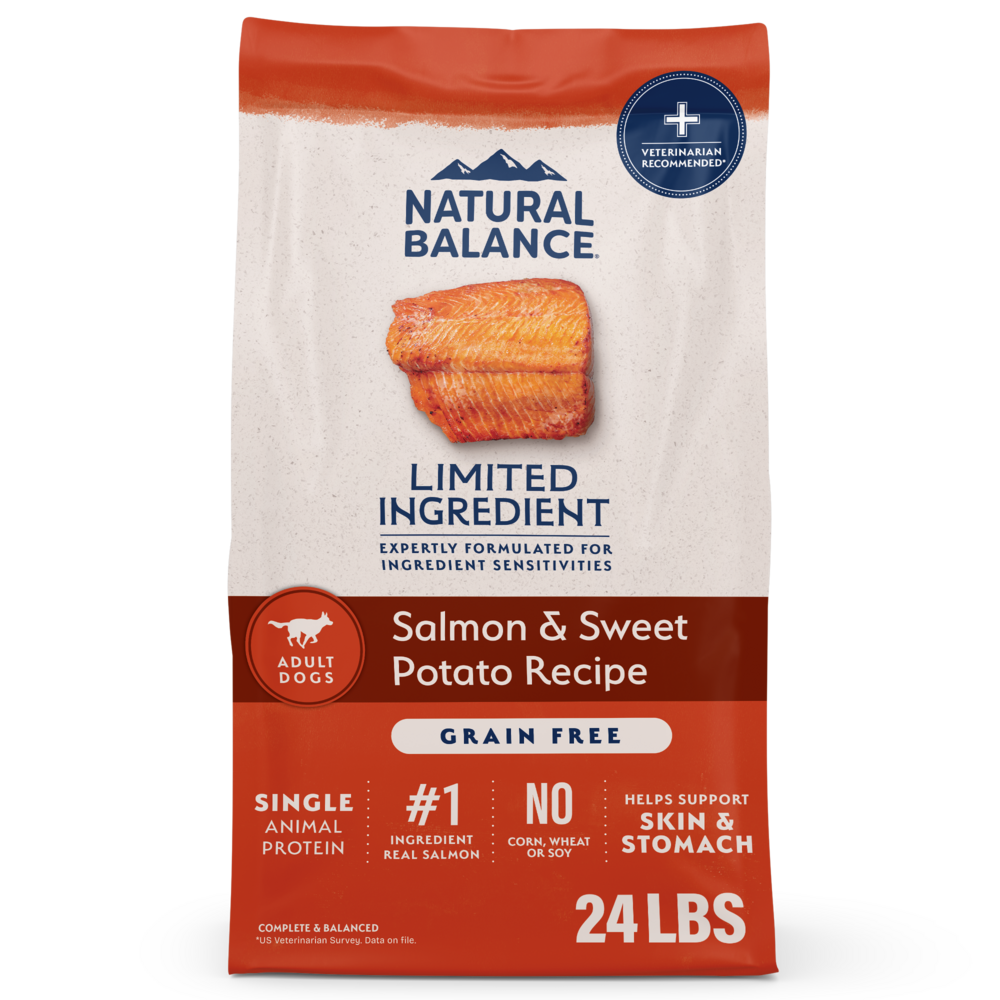 Natural Balance Limited Ingredient helps dogs with ingredient sensitivities live happy, healthy lives. Our Grain Free Salmon & Sweet Potato Recipe Dry Dog Food provides premium nutrition and a balanced & delicious meal for dogs with food sensitivities. With Real Salmon as the #1 ingredient plus sweet potatoes, this recipe is rich in omega fatty acids and healthy fiber to support skin & stomach health.