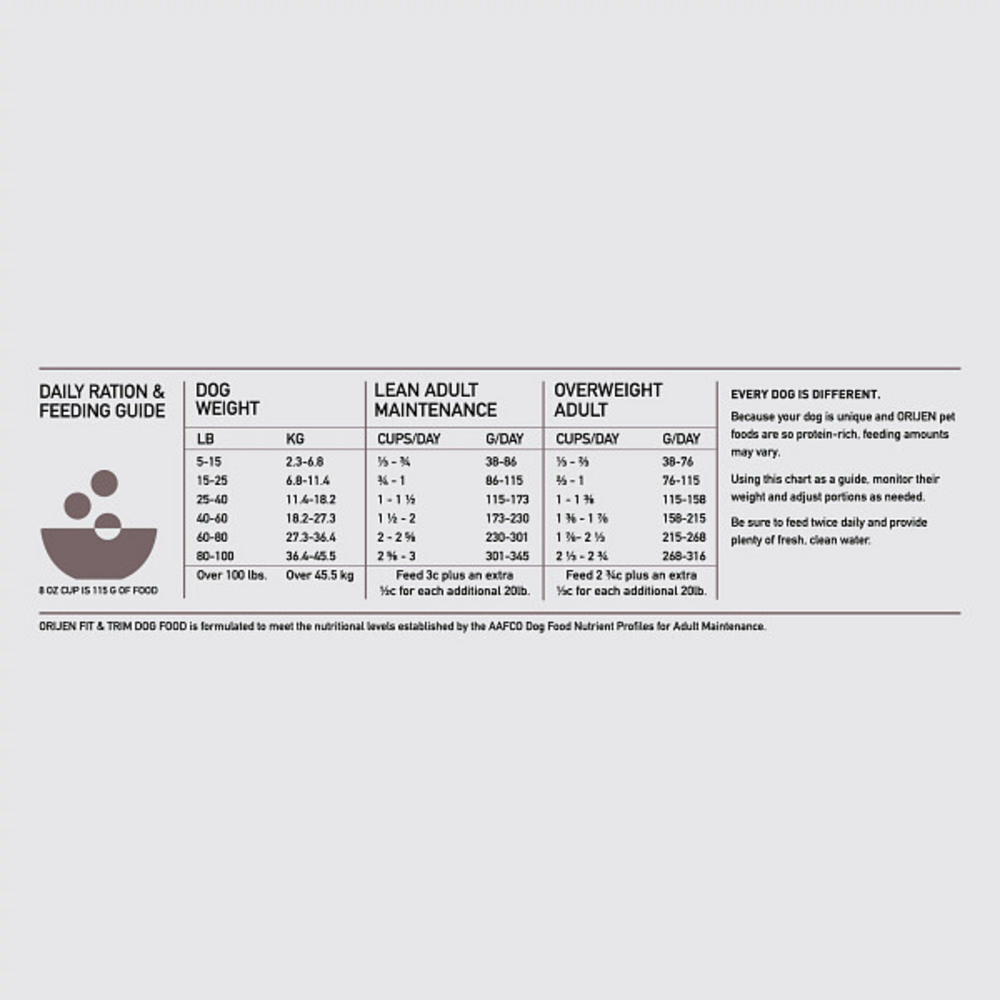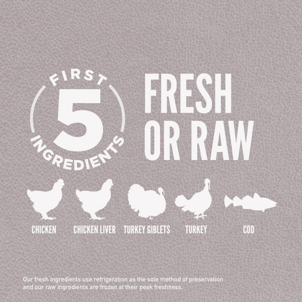 Help your dog thrive with the power of protein-rich ORIJEN Fit and Trim Dry Dog Food. This ORIJEN grain free* dry dog food is optimized to support lean muscle mass and is specifically designed to support peak physical conditioning. With a Biologically Appropriate recipe, this grain free* dog food kibble is based on what your canine's ancestors consumed in the wild. Containing 85 percent** animal ingredients, ORIJEN dog food provides a high protein diet that will nourish a lifetime of adventures. The first five ingredients of this high protein dog food are fresh or raw poultry and fish ingredients, including chicken, chicken liver, turkey giblets, turkey, and cod, giving your dog a strong source of protein, vitamins and minerals. ORIJEN WholePrey ingredients including nourishing organs provide your dog with the most succulent and nutrient-rich parts of prey, and the freeze dried coating provides a burst of flavor dogs instinctively crave. Our included fresh ingredients are delivered refrigerated and our included raw ingredients are delivered frozen. NOURISH AS NATURE INTENDED. *Produced in a facility that also processes grains **Approximate 85%. Derived from unprocessed state of the ingredients.