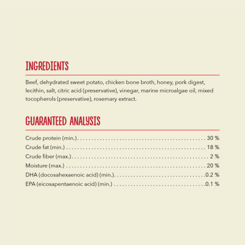 Bring home quality nutrition in a delicious treat for your dog with ACANA Chewy Tenders Beef Dog Treats. Crafted with ingredients you can feel good about, this dog treat recipe features protein-rich, savory beef and bone broth plus fiber-rich sweet potatoes to help support gut health. Sweet honey adds a soft, chewy texture to these high protein dog treats to keep your dog satisfied, making them a perfect snack when you want to treat your dog to delicious flavor and happiness. These ACANA dog treats are made with 90 percent* animal ingredients to provide a burst of protein and tempting flavor. No artificial preservatives, flavors or colors added in our kitchen and no low-cost ingredients like soy, corn, tapioca or wheat to ensure your furry family member gets only the best. Even better, nutritious ingredients like Omega-3 fatty acids from algal oil help to support hip and joint function. Choose ACANA treats to give your companion the nutritional foundation they need to live a happy, healthy life. *Approximate and derived from the unprocessed state of the ingredients