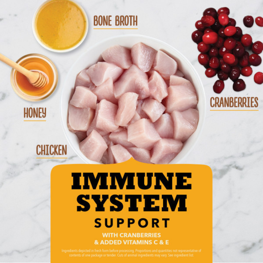 Chicken, dehydrated cranberry, chicken bone broth, honey, salt, citric acid (preservative), vinegar, vitamin C(ascorbic acid), mixed tocopherols (preservative), rosemary extract, vitamin E supplement.