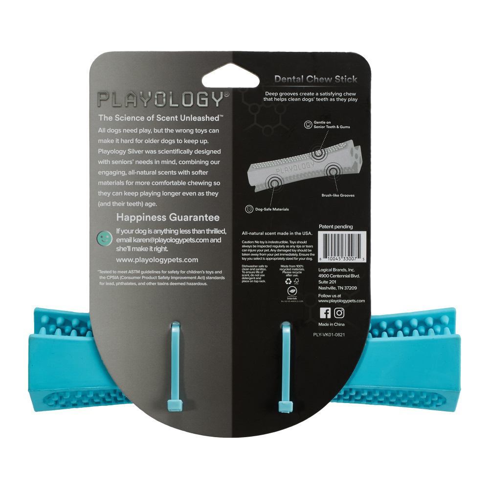 The Science of Scent Unleashed! Playology designs scented toys made from dog-safe materials that keep dogs engaged longer 7X as long as an unscented toy. Our Dental Chew Stick has brush-like grooves that create a satisfying chew that massages gums and helps clean dogs' teeth as they play. Scientifically designed for senior dogs combining our engaging all-natural scents with softer materials for more comfortable chewing so they can keep playing longer even as they (and their teeth) age. Available in two sizes and two mouthwatering scents allowing you to find the combination that perfectly suits your dog's size and taste