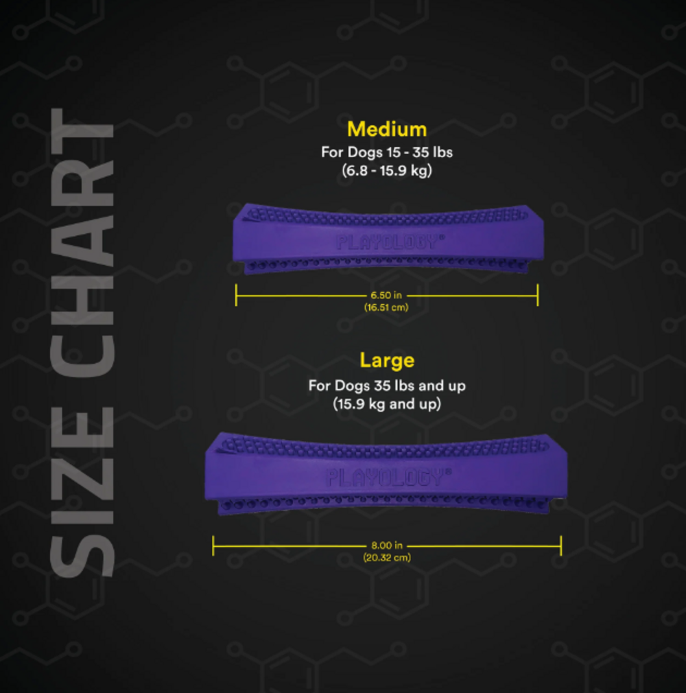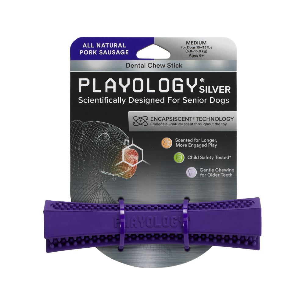 The Science of Scent Unleashed! Playology designs scented toys made from dog-safe materials that keep dogs engaged longer 7X as long as an unscented toy. Our Dental Chew Stick has brush-like grooves that create a satisfying chew that massages gums and helps clean dogs' teeth as they play. Scientifically designed for senior dogs combining our engaging all-natural scents with softer materials for more comfortable chewing so they can keep playing longer even as they (and their teeth) age. Available in two sizes and two mouthwatering scents allowing you to find the combination that perfectly suits your dog's size and taste
