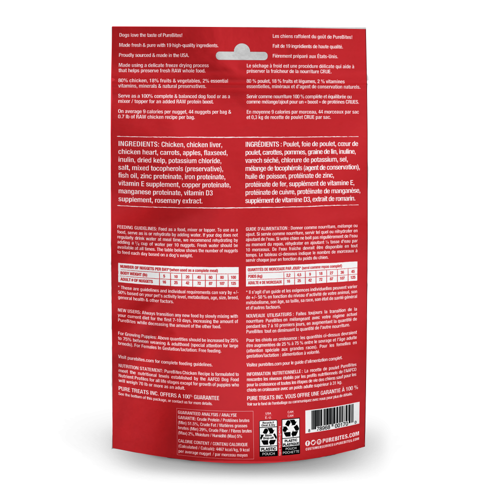- Go ahead, look at our ingredients; made with only 19 simple human grade ingredients: 80% pure chicken, 18% carrot & apple, and 2% essential vitamins, minerals, & natural preservatives. PureBites chicken recipe is proudly sourced and freeze dried RAW in the USA and can be fed as a complete & balanced food, mixer, or topper for your dog