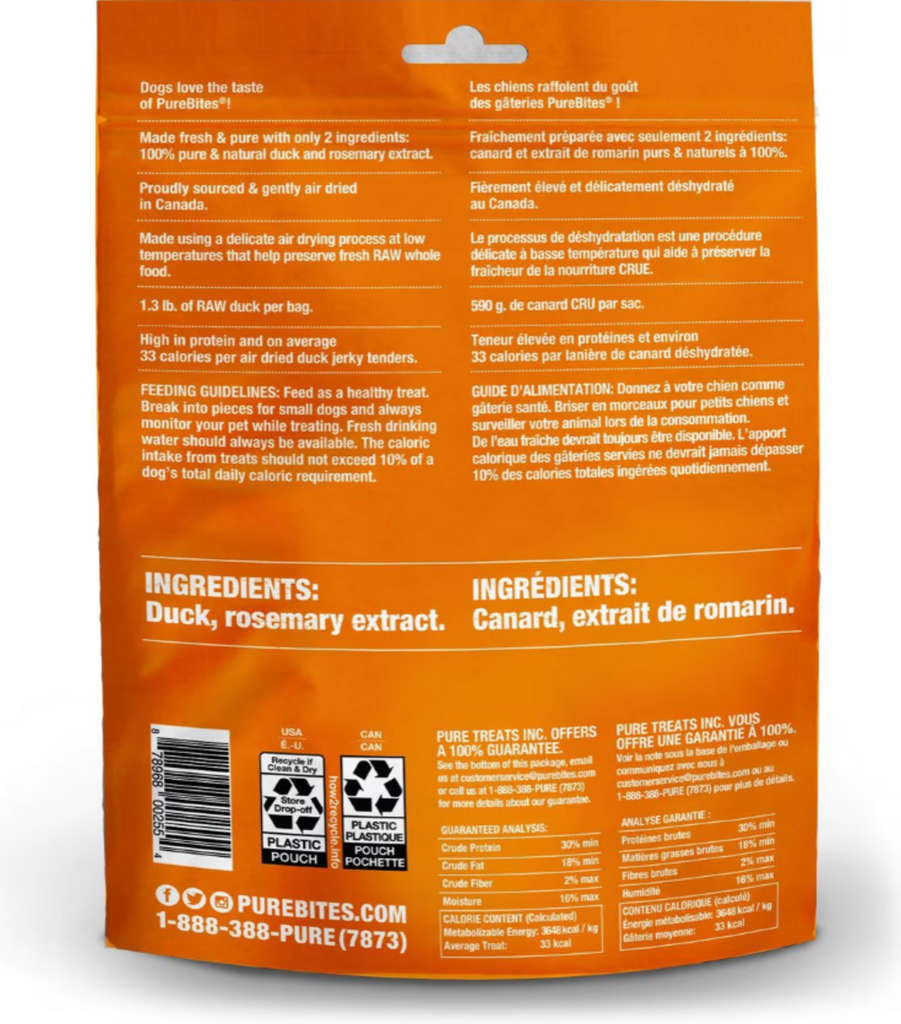 Go ahead, turn the bag around and look at our ingredients. PureBites® Duck Jerky is made with only 2 ingredients; 100% Pure & Natural Duck and Rosemary Extract. Dogs love the taste of PureBites® because our treats are gently air dried to lock in the aroma, texture and freshness they crave. Dog parents love PureBites® because our treats are 100% pure and rich in nutrients for a happy and healthy life. PureBites® Duck Jerky is proudly Sourced and Gently Air Dried in Canada. PureBites® are made using a delicate air drying process at low temperatures that help preserve fresh RAW whole food. High in protein and on average 33 calories per air dried duck jerky strip. Our products are ideal for dogs with health issues or pets that are overweight, diabetic, have allergies, gastrointestinal disorders, or are on a restricted diet. PureBites® Duck Jerky 5.5oz | 156g has 1.3 lb of RAW Duck per bag.