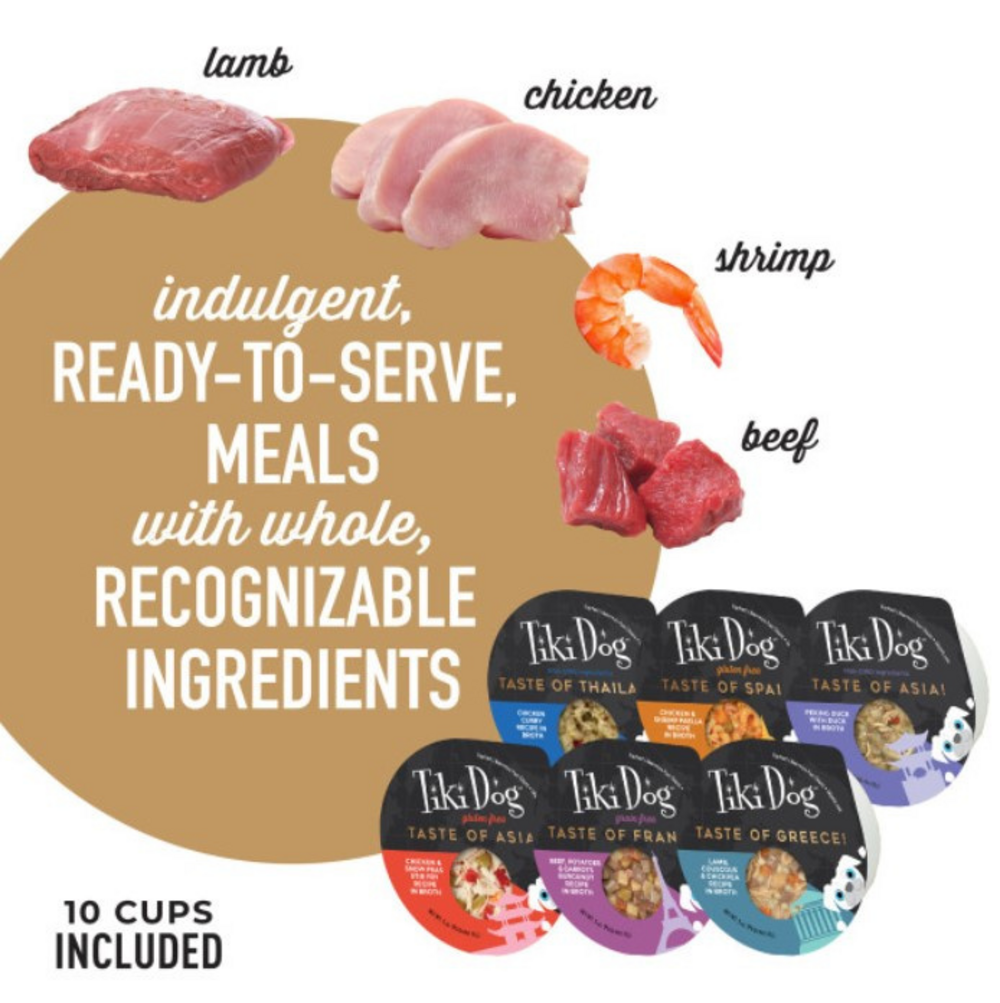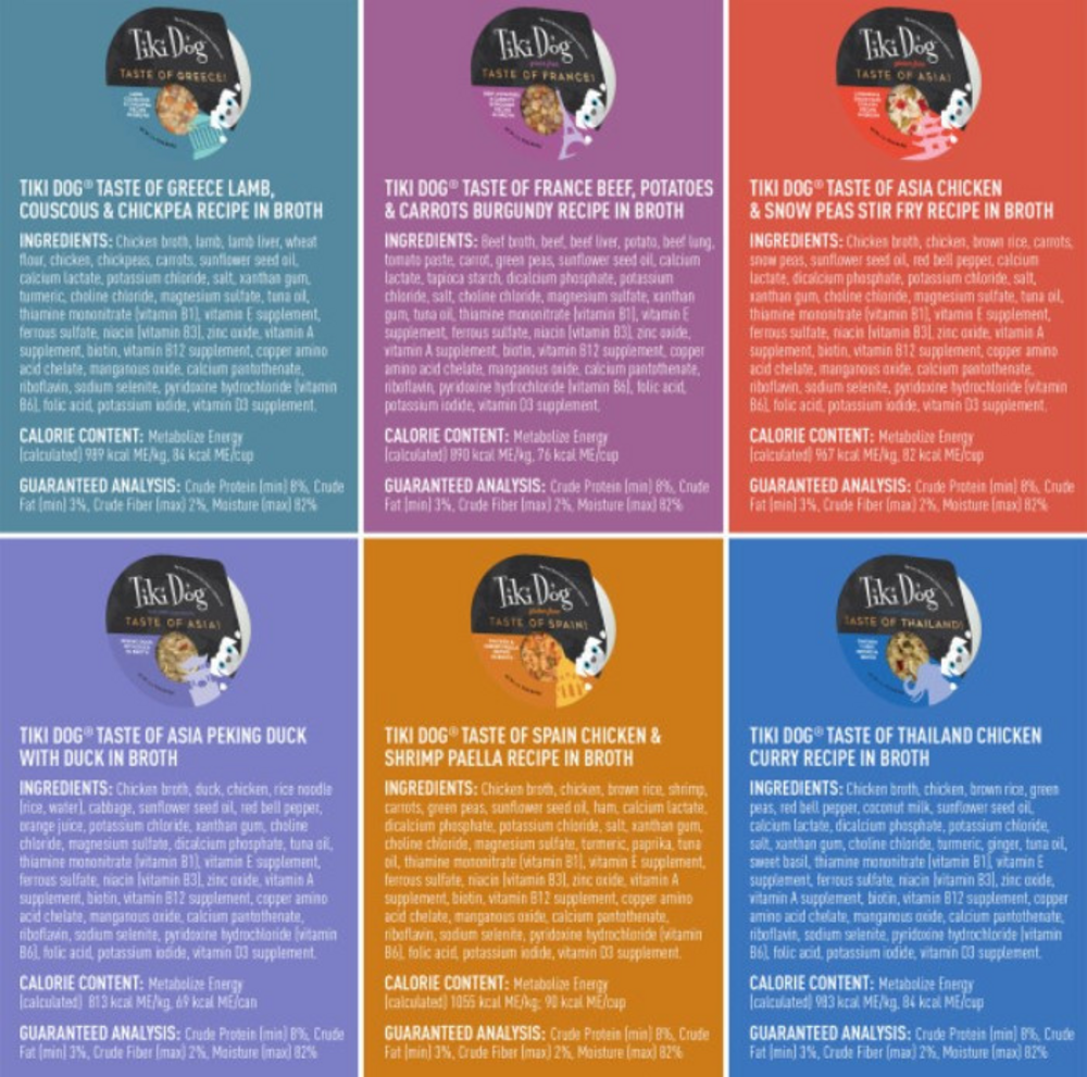 Treat your pup to a gourmet international experience with Tiki Dog Italian Carbonara French Burgundy Spanish Paella and Asian Stir fry. All are hearty delicatessen meals with savory meats served over pasta or rice. WET DOG FOOD – Made with real Meat and other high-quality ingredients, and your pup will look forward to meal time. RECIPE DESIGNED FOR ADULT MAINTENANCE –Tiki Dog Taste of the World is formulated to meet the nutritional levels established by the AAFCO Dog Food Nutrient Profiles for Adult Maintenance. HIGH PROTEIN & MOISTURE – Count on the broth to provide protein and supplemental moisture at each meal.