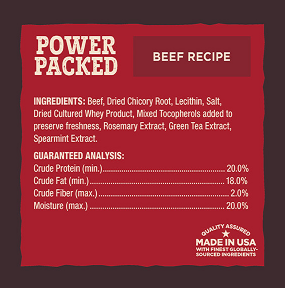 Beef, Turkey, Chickpeas, Ground Potatoes, Vegetable Glycerin, Guar Gum, Carrots, Cane Molasses, Salt, Natural Smoke Flavor, Blueberries, Garlic Powder, Flaxseed, Phosphoric Acid, Sweet Potatoes, Apples, Sorbic Acid (a preservative), Mixed Tocopherols added to preserve freshness, Rosemary Extract, Green Tea Extract, Spearmint Extract.Guaranteed Analysis