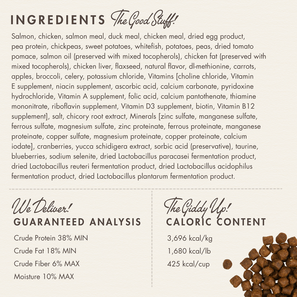 Salmon, Chicken, Salmon Meal, Duck Meal, Chicken Meal, Dried Egg Product, Pea Protein), Chickpeas, Sweet Potatoes, Whitefish, Potatoes, Peas, Dried Tomato Pomace, Salmon Oil (preserved with mixed tocopherols),Chicken Fat (preserved with mixed tocopherols),Chicken Liver, Flaxseed, Natural Flavor, DL-Methionine, Carrots, Apples, Broccoli, Celery, Vitamins [Potassium Chloride, Choline Chloride, Vitamin E Supplement, Niacin Supplement, Ascorbic Acid], Calcium Carbonate, Vitamins [Pyridoxine Hydrochloride, Vitamin A Supplement, Folic Acid, Calcium Pantothenate, Thiamine Mononitrate, Riboflavin Supplement, Vitamin D3 Supplement, Biotin, Vitamin B12 Supplement], Salt, Chicory Root Extract, Minerals [Zinc Sulfate, Manganese Sulfate, Ferrous Sulfate, Magnesium Sulfate, Zinc Proteinate, Ferrous Proteinate, Manganese Proteinate, Copper Sulfate, Magnesium Proteinate, Copper Proteinate, Calcium Iodate], Cranberries, Yucca Schidigera Extract, Sorbic Acid (Preservative), Taurine, Blueberries, Sodium Selenite, Dried Lactobacillus paracasei Fermentation Product, Dried Lactobacillus reuteri Fermentation Product, Dried Lactobacillus acidophilus Fermentation Product.Guaranteed Analysis