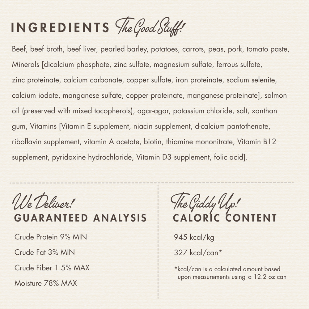 Beef, Beef Broth, Beef Liver, Whole Barley, Potatoes, Carrots, Peas, Pork, Tomato Paste, Minerals [Dicalcium Phosphate, Zinc Sulfate, Magnesium Sulfate, Ferrous Sulfate, Zinc Proteinate, Calcium Carbonate, Iron Proteinate, Sodium Selenite, Calcium Iodate, Manganese Sulfate, Copper Proteinate, Manganese Proteinate], Salmon Oil (preserved with mixed tocopherols),Agar-Agar, Potassium Chloride, Salt, Xanthan Gum, Vitamins [Vitamin E Supplement, Niacin Supplement, Calcium Pantothenate, Riboflavin Supplement, Vitamin A Supplement, Biotin, Thiamine Mononitrate, Vitamin B12 Supplement, Pyridoxine Hydrochloride, Vitamin D3 Supplement, Folic Acid].Guaranteed Analysis