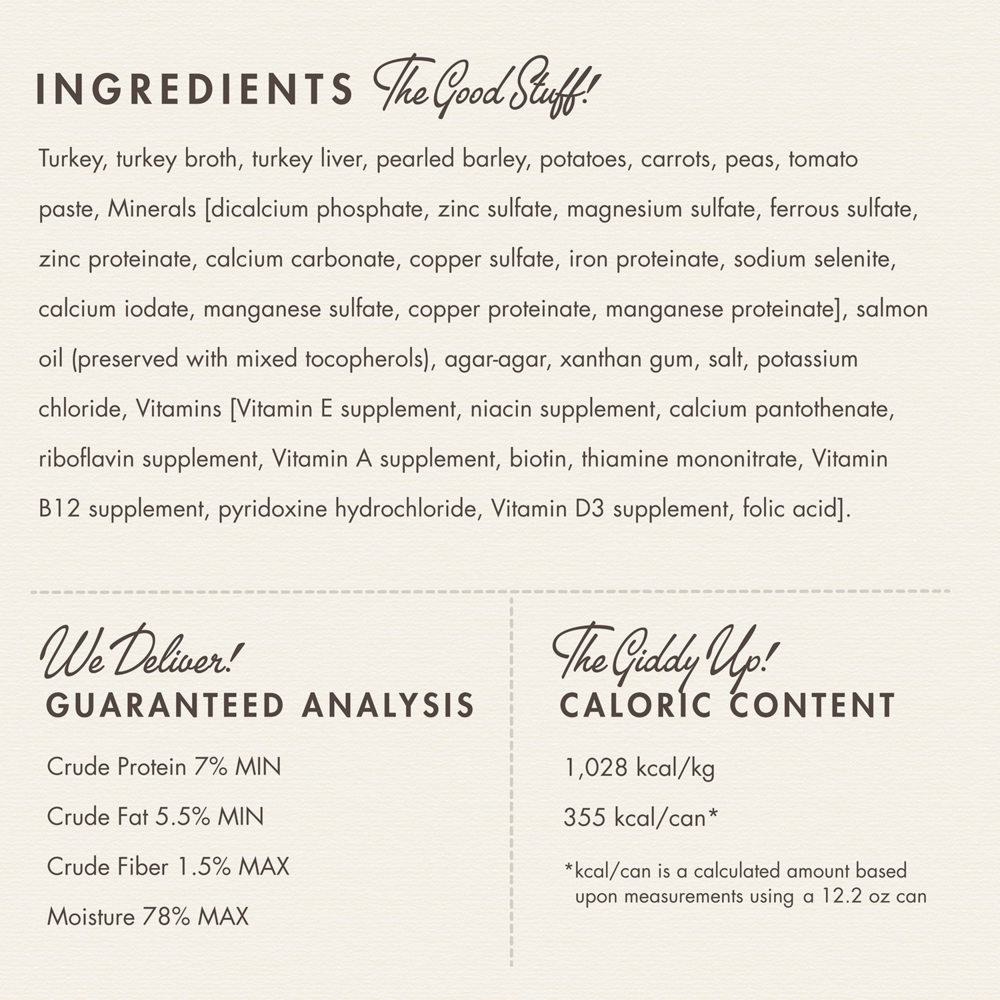 Turkey, Turkey Broth, Turkey Liver, Pearled Barley, Potatoes, Carrots, Peas, Tomato Paste, Minerals [Dicalcium Phosphate, Zinc Sulfate, Magnesium Sulfate, Ferrous Sulfate, Zinc Proteinate, Calcium Carbonate, Copper Sulfate, Iron Proteinate, Sodium Selenite, Calcium Iodate, Manganese Sulfate, Copper Proteinate, Manganese Proteinate], Salmon Oil (preserved with mixed tocopherols),Agar-Agar, Xanthan Gum, Salt, Vitamins [Potassium Chloride, Vitamin E Supplement, Niacin Supplement, Calcium Pantothenate, Riboflavin Supplement, Vitamin A Supplement, Biotin, Thiamine Mononitrate, Vitamin B12 Supplement, Pyridoxine Hydrochloride, Vitamin D3 Supplement, Folic Acid].Guaranteed Analysis