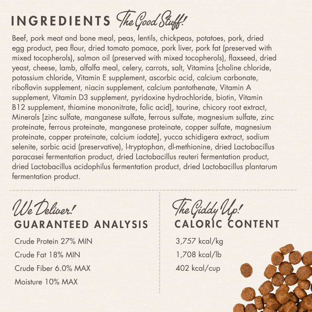 Beef,Pork Meat & Bone Meal,Peas,Lentils,Chickpeas,Potatoes,Pork,Dried Egg Product,Pea Flour,Dried Tomato Pomace,Pork Liver,Pork Fat (preserved with mixed tocopherols),Salmon Oil (preserved with mixed tocopherols),Flaxseed,Cheese,Dried Yeast,Lamb,Alfalfa Meal,Celery,Carrots,Salt, Vitamins [Choline Chloride, Potassium Chloride, Vitamin E Supplement, Ascorbic Acid, Calcium Carbonate, Riboflavin Supplement, Niacin Supplement, Calcium Pantothenate, Vitamin A Supplement, Vitamin D3 Supplement, Pyridoxine Hydrochloride, Biotin, Vitamin B12 Supplement, Thiamine Mononitrate, Folic Acid],Taurine,Chicory Root Extract, Minerals [Zinc Sulfate, Manganese Sulfate, Ferrous Sulfate, Magnesium Sulfate, Zinc Proteinate, Iron Proteinate, Manganese Proteinate, Copper Sulfate, Magnesium Proteinate, Copper Proteinate, Calcium Iodate], Yucca Schidigera Extract,Sodium Selenite,Sorbic Acid (Preservative),L-Tryptophan,DL-Methionine,Dried Lactobacillus casei Fermentation Product,Dried Lactobacillus reuteri Fermentation Product,Dried Lactobacillus acidophilus Fermentation Product,Dried Lactobacillus plantarum Fermentation ProductGuaranteed Analysis