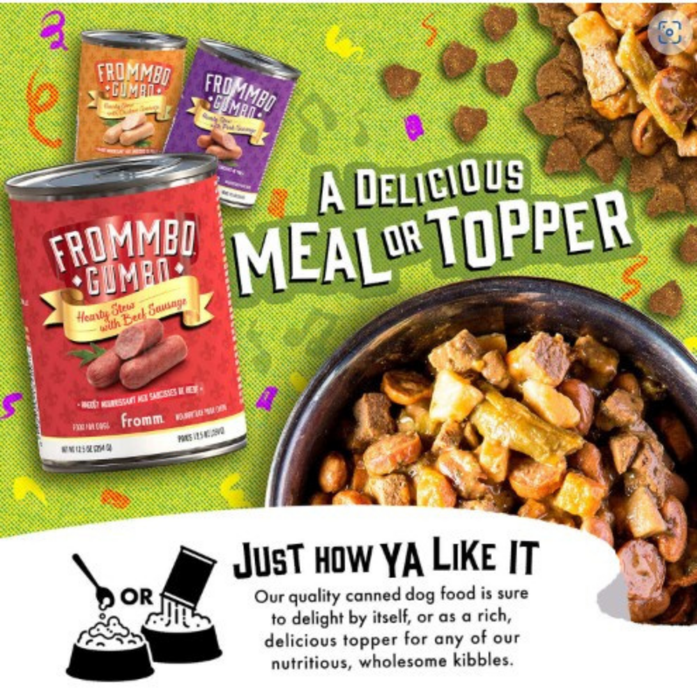 Frommbo Gumbo Hearty Stew with Beef Sausage is made with thick cuts of beef sausage, rich bone broth, potatoes, and carrots. Produced at Fromm's hands-on family-owned-and-operated facilityA complement to Fromm dry formulas. Free from artificial colors, flavors or preservatives. Fromm Family Foods is a fifth generation family-owned-and-operated artisan pet food company.