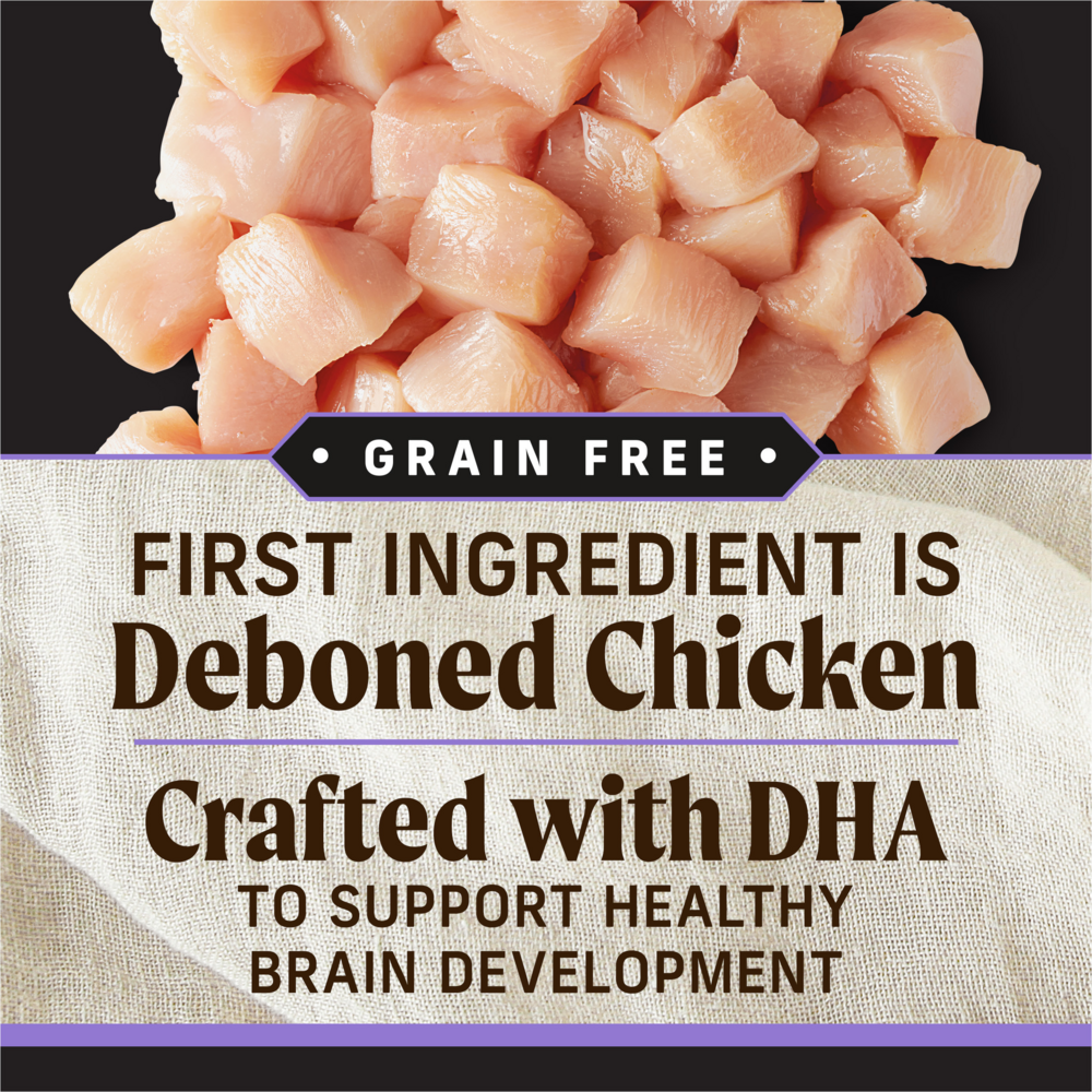 - Real deboned chicken is the first ingredient in this high protein dog food formulated for puppies to help developing healthy muscles and energy levels, with added vitamins, minerals and nutrients