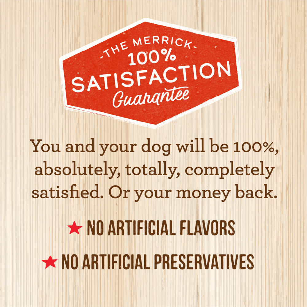 Serve your dog a high quality meal with Merrick Dog Food, Chunky Grain Free Colossal Chicken Dinner in Gravy recipe. This premium grain free dog food recipe is a canned wet dog food crafted with real deboned chicken as the number one ingredient and contains high protein to support your dog’s lean muscle mass and healthy energy levels. Additionally, this wholesome, healthy dog food is crafted with a holistic blend of soft carrots and peas together in a savory gravy that adds flavor and moisture to your dog’s diet. Use this dog canned food as a topper for your dog’s dry kibble or as a delicious standalone meal your dog will love. Grain free, chunky, and natural, with added vitamins and minerals, this real meat dog food is crafted without artificial flavors or preservatives. Merrick dog wet food is proudly founded in Hereford, Texas, crafted in USA facilities.