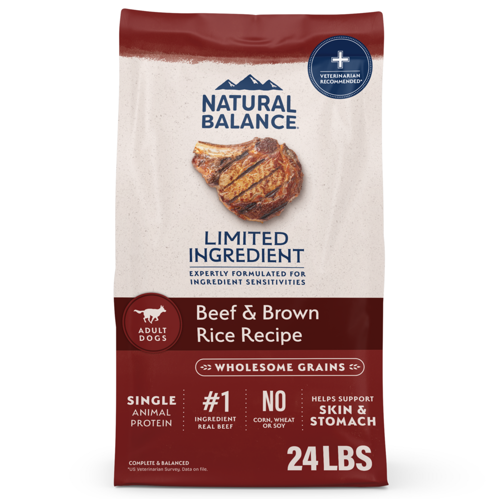 Sometimes what?s NOT in your dog?s food is just as important as what is. That?s the guiding philosophy behind Natural Balance L.I.D. Limited Ingredient Diets Beef & Brown Rice Formula, a super premium dry dog food made to help feed your dog?s greatness. Our beef and brown rice formula is made without commonly added ingredients like peas, corn, wheat or soy. Instead, you'll find real beef as the #1 ingredient and easily digestible whole grain brown rice. We also added essential vitamins and minerals to provide your adult dog with a complete and balanced diet to help support his nutritional needs. For dogs both big and small, the choice is simple: Natural Balance is what you need to feed them with confidence!