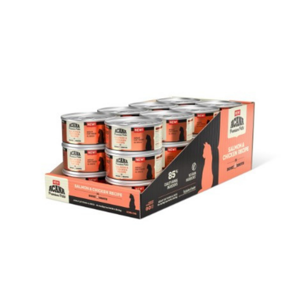 - Twenty Four (24) 3 oz cans of ACANA PREMIUM PATE Salmon and Chicken in Bone Broth Wet Cat Food