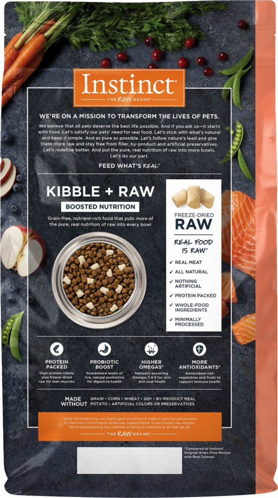 High animal-protein, grain-free, boosted nutrition with bites of freeze-dried raw meat, Instinct® Raw Boost® Grain-Free Recipe with Real Salmon is a better way to feed kibble. Unlock your dog’s potential to thrive and put more of the pure, real nutrition of raw into every bowl.?Boosted Nutrition - Grain-Free, High Protein Kibble + Freeze-Dried RawWild-caught salmon is the first ingredient - packed with animal protein for strong, lean musclesFreeze-Dried Raw - All natural, protein packed, minimally processed bites of real salmonProbiotic boost, higher Omegas* and more antioxidants* for digestive health, healthy skin & coat, and immune health
