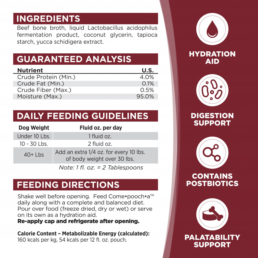 Show your pooch some love with a dose of nutritious and delicious NutriSource Come·pooch·a Beef bone broth. A Kombucha inspired topper for dogs. Pour over food as a tasty topper, add to water, or serve as is for hydration and palatability support. Support digestion with natural postbiotics from fermentation products. Formulated with Alltech® ingredients made exclusively for NutriSource. Family owned means we make decisions based on what’s best for your family pets!