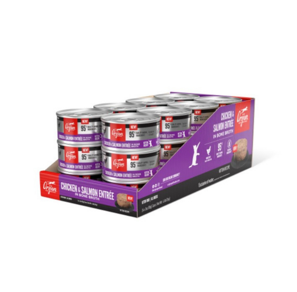 - Twenty Four (24) 3 oz cans of ORIJEN Kitten Chicken and Salmon Entree in Bone Broth Wet Cat Food
