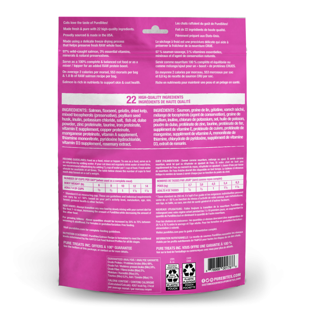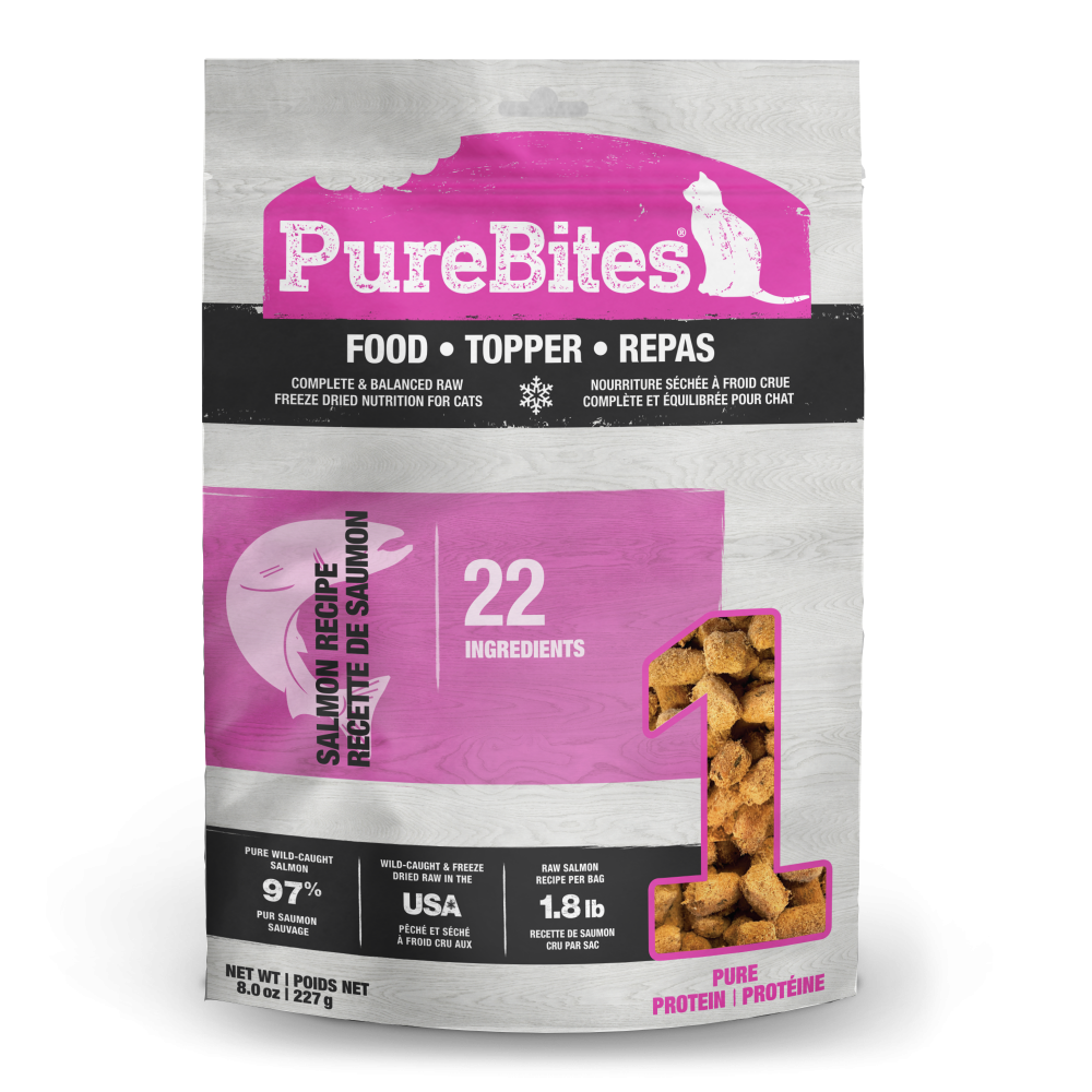 • Go ahead, look at our ingredients; made with only 22 simple human grade ingredients: 97% pure wild-caught salmon and 3% essential vitamins, minerals, & natural preservatives. PureBites salmon recipe is proudly sourced and freeze dried RAW in the USA and can be fed as a complete & balanced food, mixer, or topper for your cat