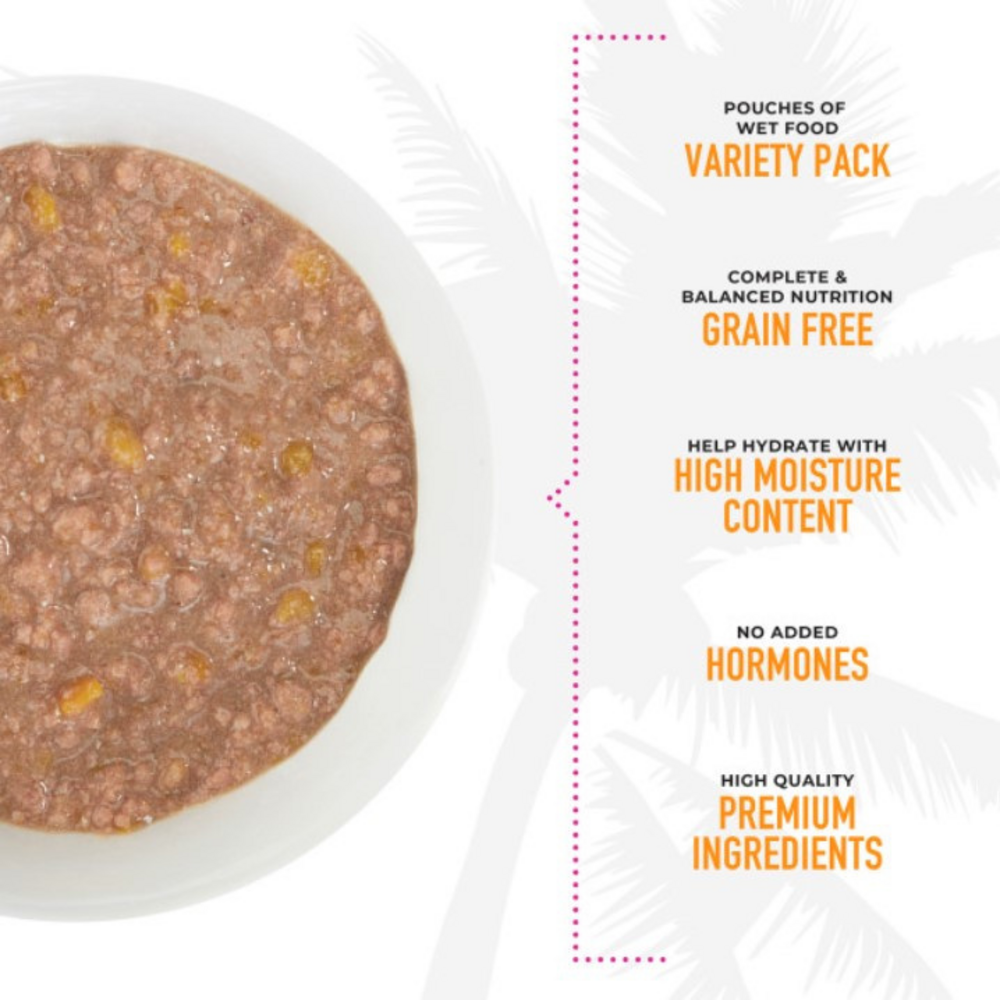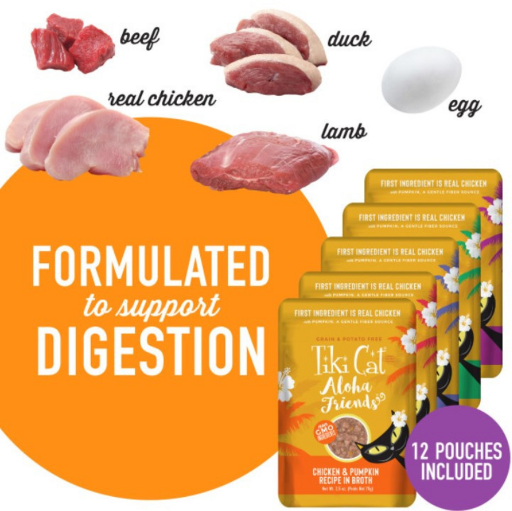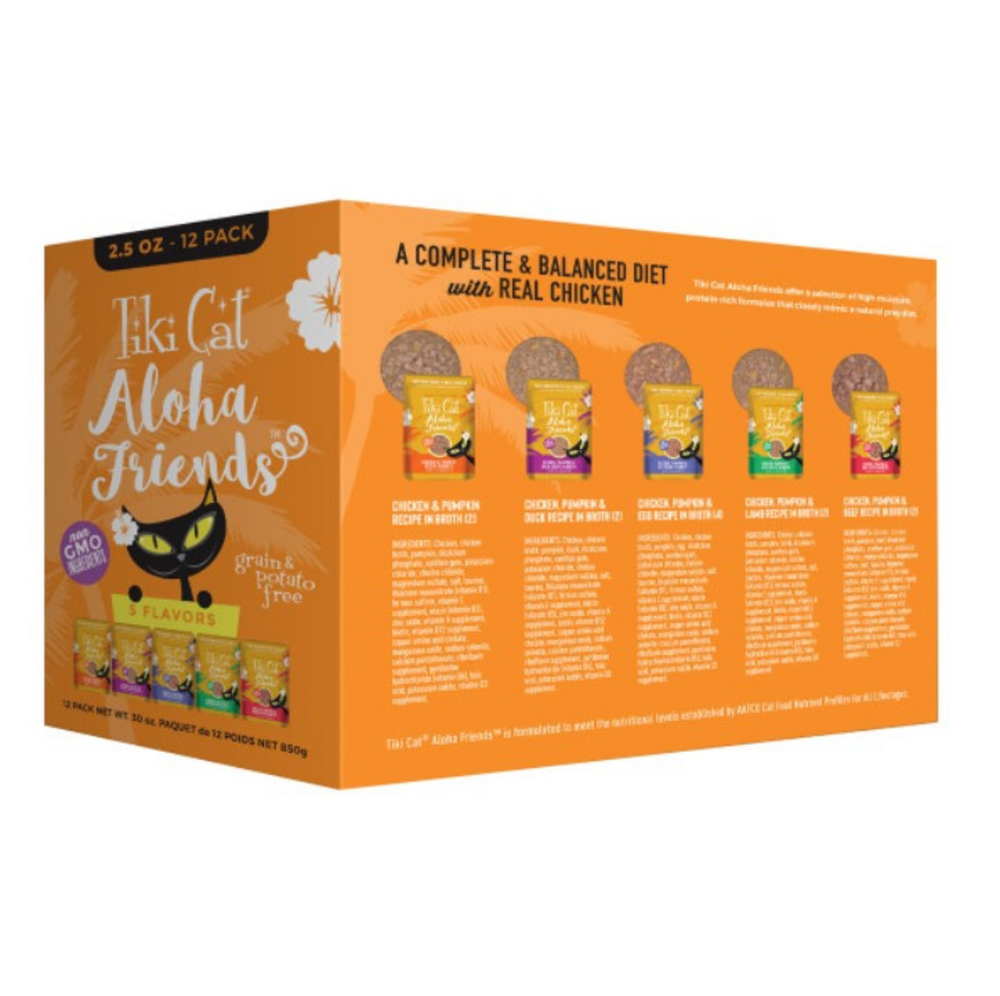 Tiki Cat Aloha FriendsWet Cat Food is a delicious meal featuring a combination of flavors from chicken beef lamb pork and duck with easy to digest pumpkin. WET CAT FOOD VARIETY PACK POUCHES - 12 pouches and 5 recipes Variety is the spice of life to excite your cat with a new flavor at every meal.GRAIN FREE CAT FOOD – Complete and balanced nutrition in every pouch of Aloha Friends wet cat food that is ideal for all life stages. ONLY QUALITY INGREDIENTS - Grain free, potato free, no carrageenan, no added hormones, no artificial colors or flavors.