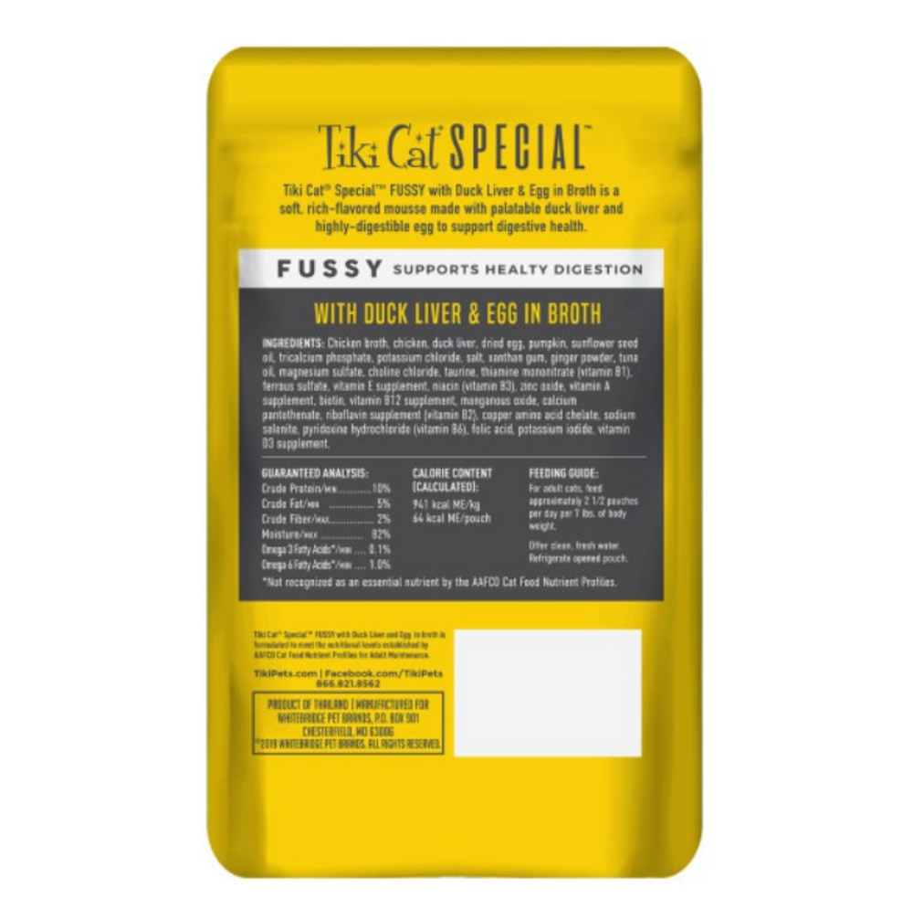 Tiki Cat SpecialFUSSY with Duck Liver & Egg in Broth Wet Cat Food is a soft richflavored mousse made with palatable duck liver and highlydigestible egg to support digestive health. It's made with nonGMO ingredients including gentle pumpkin fiber. FUNCTIONAL WET CAT FOOD - Tiki Cat Special is a formula developed specifically to support your cat to have healthy digestion.TIKI CAT SPECIAL FUSSY - is a soft, rich flavored cat food mousse made with palatable duck liver and highly digestible egg to support digestive health. ONLY QUALITY INGREDIENTS - High protein, made with real chicken and duck liver, no grains, no by-products, no fillers and no carrageenan.